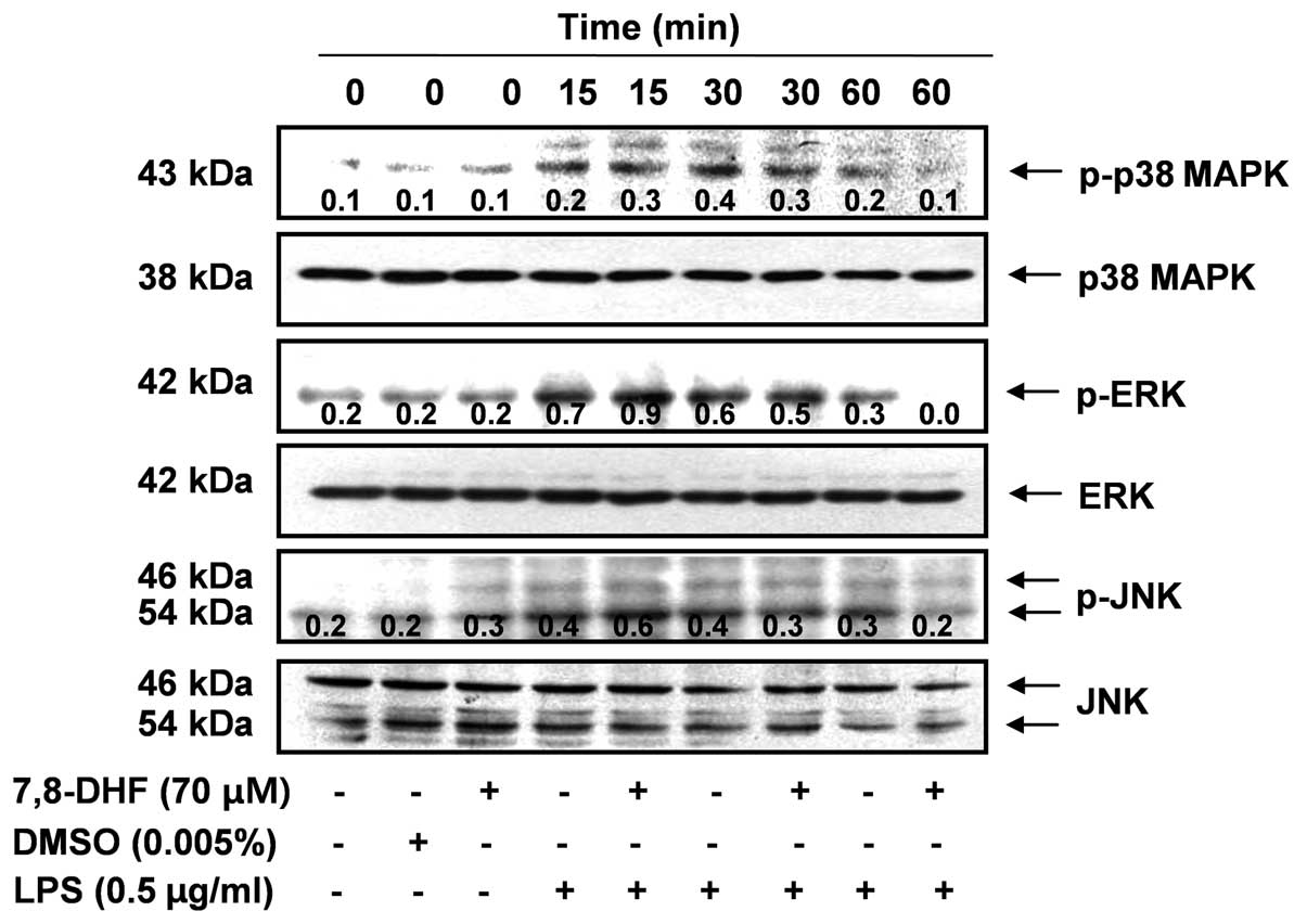 MAPK pathways are known to be important for the expression of pro-inflammatory mediators and cytokines. Therefore, MAPKs act as specific targets for inflammatory responses. To examine whether the inhibition of inflammation by 7,8-DHF is mediated through MAPK pathways, we examined the effects of 7,8-DHF on the LPS-induced phosphorylation of p38 MAPK, ERK and JNK in BV2 microglial cells by western blot analysis. 7,8-DHF attenuated the LPS-induced phosphorylation of these kinases (Fig. 7). By contrast, the levels of total MAPK proteins were unaffected by either LPS or 7,8-DHF treatment. These results suggest that the activation of MAPKs may be involved in the inhibitory effects of 7,8-DHF on LPS-induced pro-inflammatory mediators in BV2 microglial cells.