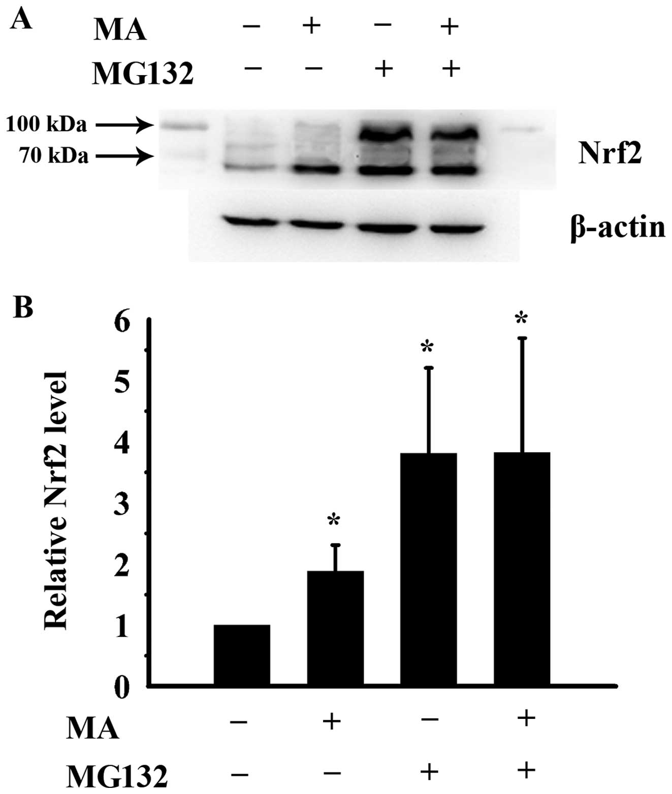 Total RNA was isolated using RNAiso Plus according to the manufacturer’s instructions. Total RNA was isolated using RNAiso Plus, and then 400 ng total RNA were reverse transcripted into cDNA. Subsequently, 2 μl cDNA were amplified with SYBR-Green Universal PCR Master mix in triplicate on a real-time PCR system (CFX96, Bio-Rad). Nrf2 mRNA levels related to β-actin levels were calculated using the ΔCt (cycle threshold) method. The primer sequences for human Nrf2 were: forward, 5′-ACTCCGGCATTTCACTAAACACAAG-3′ and reverse, 5′-CTGAGGCCAAGTAGTGTGTCTCCA-3′. The primer sequences for human β-actin were: forward, 5′-GCCCAGTCCTCTCCCAAGTC-3′ and reverse, 5′-GGCACGAAGGTCATCATTC-3′. Control cells were processed in an identical manner apart from MA treatment.