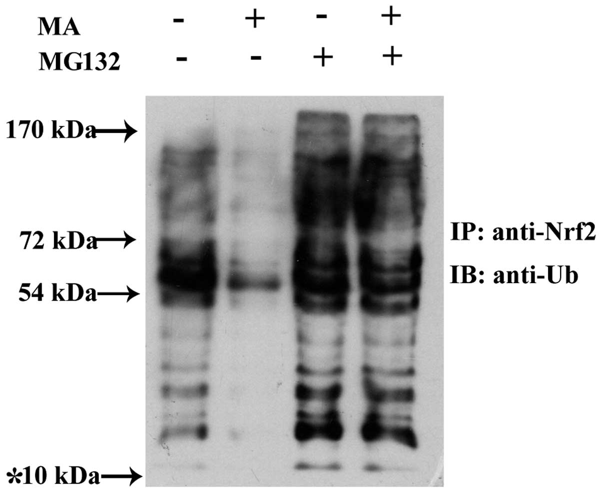 To investigate whether MA suppresses Nrf2 ubiquitination, we performed IP experiments to pull down Nrf2 from the cell lysis of HL60 cells, and then identified ubiquitinated Nrf2 by immunoblot analysis with anti-ubiquitin monoclonal antibody. As shown in Fig. 5, the 10 kDa band represents ubiquitinated Nrf2; the levels of ubiquitinated Nrf2 decreased when the HL60 cells were treated with MA. On the contrary, these conjugated proteins significantly accumulated when the cells were incubated with the proteasome inhibitor, MG132. These results suggest that MA decreases Nrf2 degradation by inhibiting its ubiquitination.