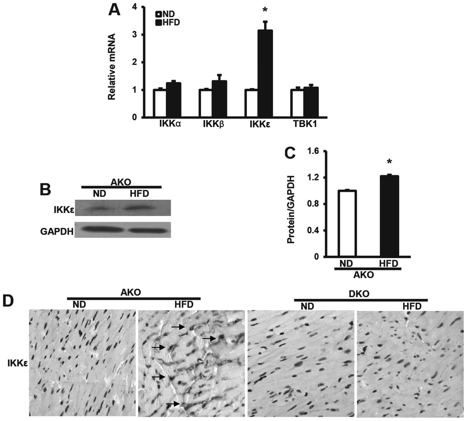 To investigate the potential response of the inducible IKK family members to dietary stresses, we first analyzed the mRNA levels of IKKs after ND or HFD for 12 weeks by qRT-PCR. IKKɛ mRNA levels in the murine hearts were significantly upregulated at 12 weeks after HFD, compared with the expression of IKKα, β and TBK1 (Fig. 1A). Consistent with these data, the protein expression levels of IKKɛ in hearts from ApoE(−/−) mice after 12-week HFD also showed the same trends by western blot analysis assays (Fig. 1B and C), suggesting that IKKɛ plays a different role to IKKα, β and TBK1 in hearts. We then examined expression in murine hearts by immunohistochemical analysis. As expected, IKKɛ expression was frequently elevated in the ApoE(−/−) group HFD-fed mice as compared to the ND controls. Notably, we observed distinct IKKɛ staining, distributed diffusely in the nucleus or cytoplasm, or both (Fig. 1D). However, no staining was observed in the ApoE(−/−)/IKKɛ(−/−) group at the same time, confirming that IKKɛ expression was absent in the hearts. Thus, the altered pattern of IKKɛ expression in the hearts, suggested the possibility that IKKɛ functions as a modulator of HFD-induced metabolic and cardiovascular disorders.
