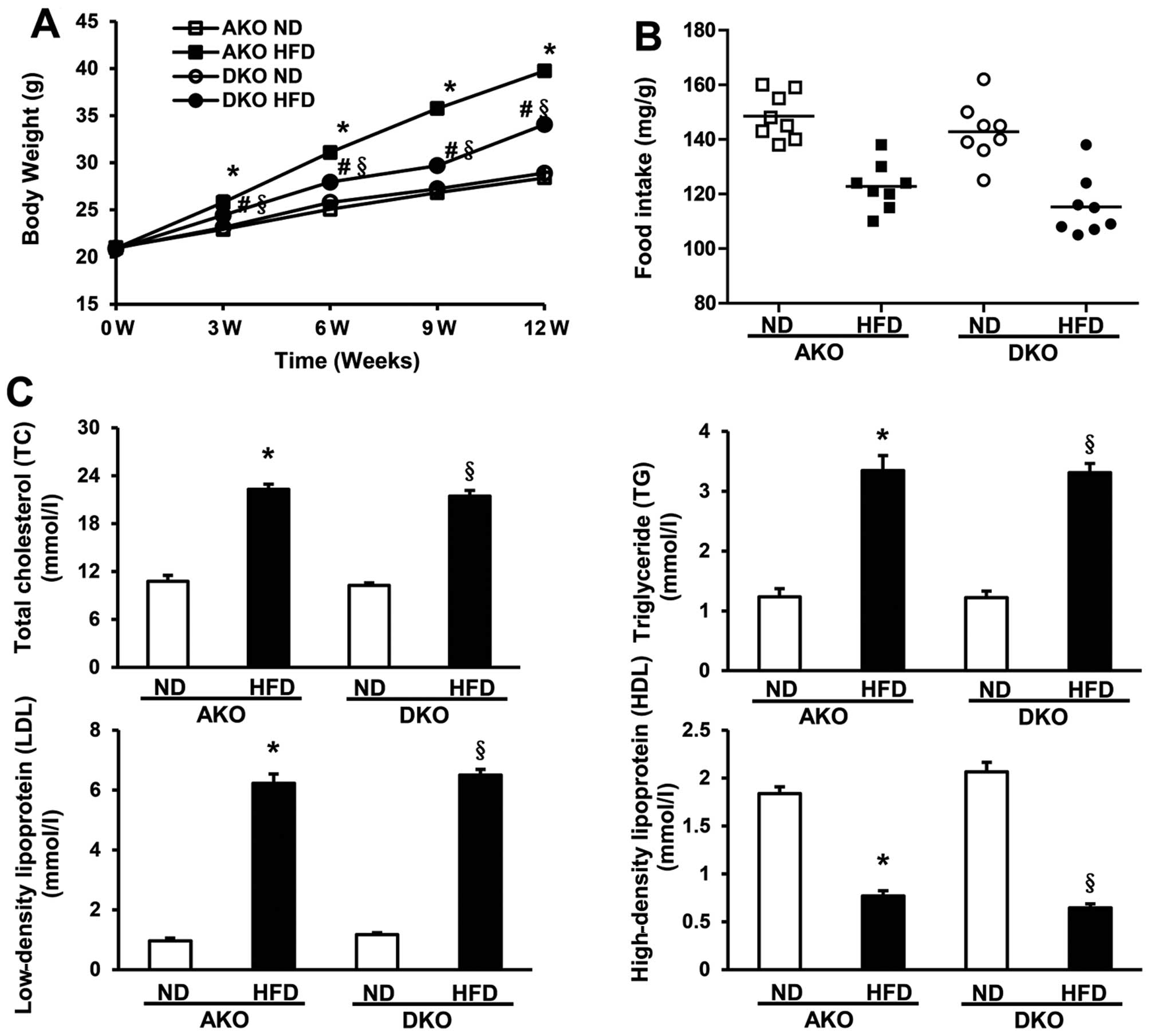 After being fed with ND and HFD for 12 weeks, respectively, mice were fasted for 12 h prior to being anesthetized through administration of intraperitoneal injection of pentobarbital (50 mg/kg body weight), and the adequacy of anesthesia was evaluated by monitoring hind limb reflexes. Blood samples were obtained from the retro-orbital plexus. Total cholesterol (TC), triglycerides (TG), low-density lipoprotein (LDL) and high-density lipoprotein (HDL) in the serum were determined using colorimetric enzymatic assays that were adjusted to the 96-well format (Sigma, St. Louis, MO, USA).