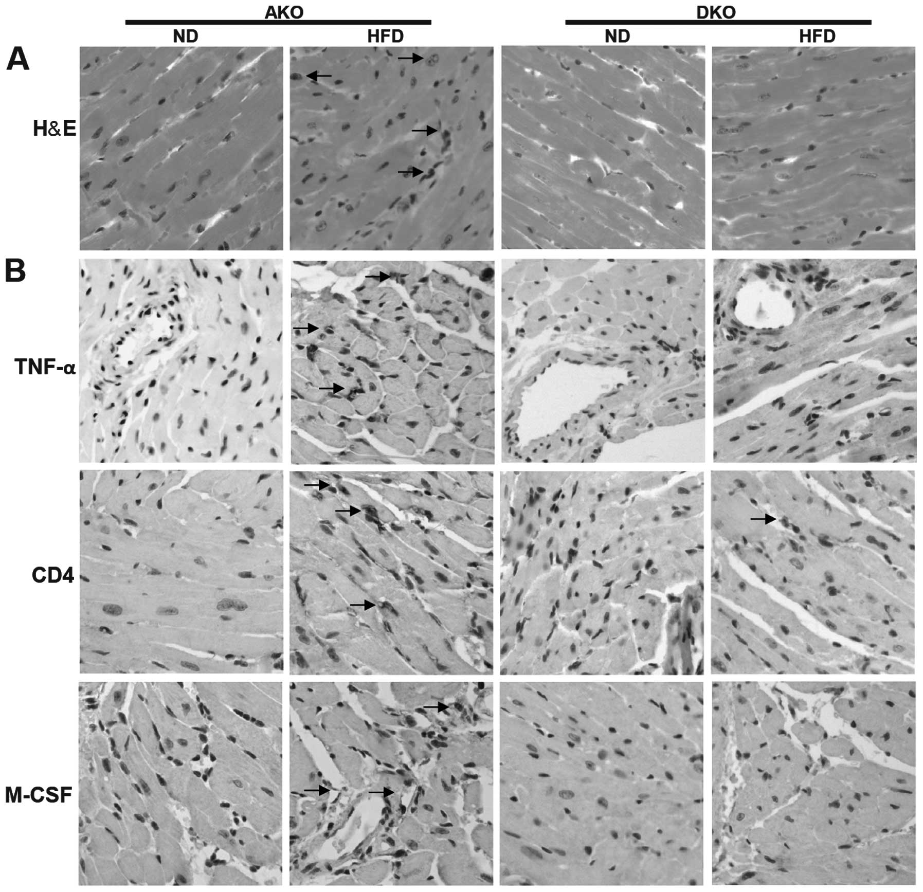 Comparison of ApoE(−/−) and ApoE(−/−)/IKKɛ(−/−) animals on ND revealed similar inflammatory mediators including TNF-α, CD4 and M-CSF (Fig. 3B). Following HFD feeding, the inflammatory markers were increased in the two groups, and showed a trend towards higher values compared to the ApoE(−/−)/IKKɛ(−/−) mice, suggesting suppressive inflammatory activity in the heart of ApoE(−/−)/IKKɛ(−/−) mice. Thus, IKKɛ may contribute to the generation of low-grade, sustained inflammation in the heart after HFD feeding.