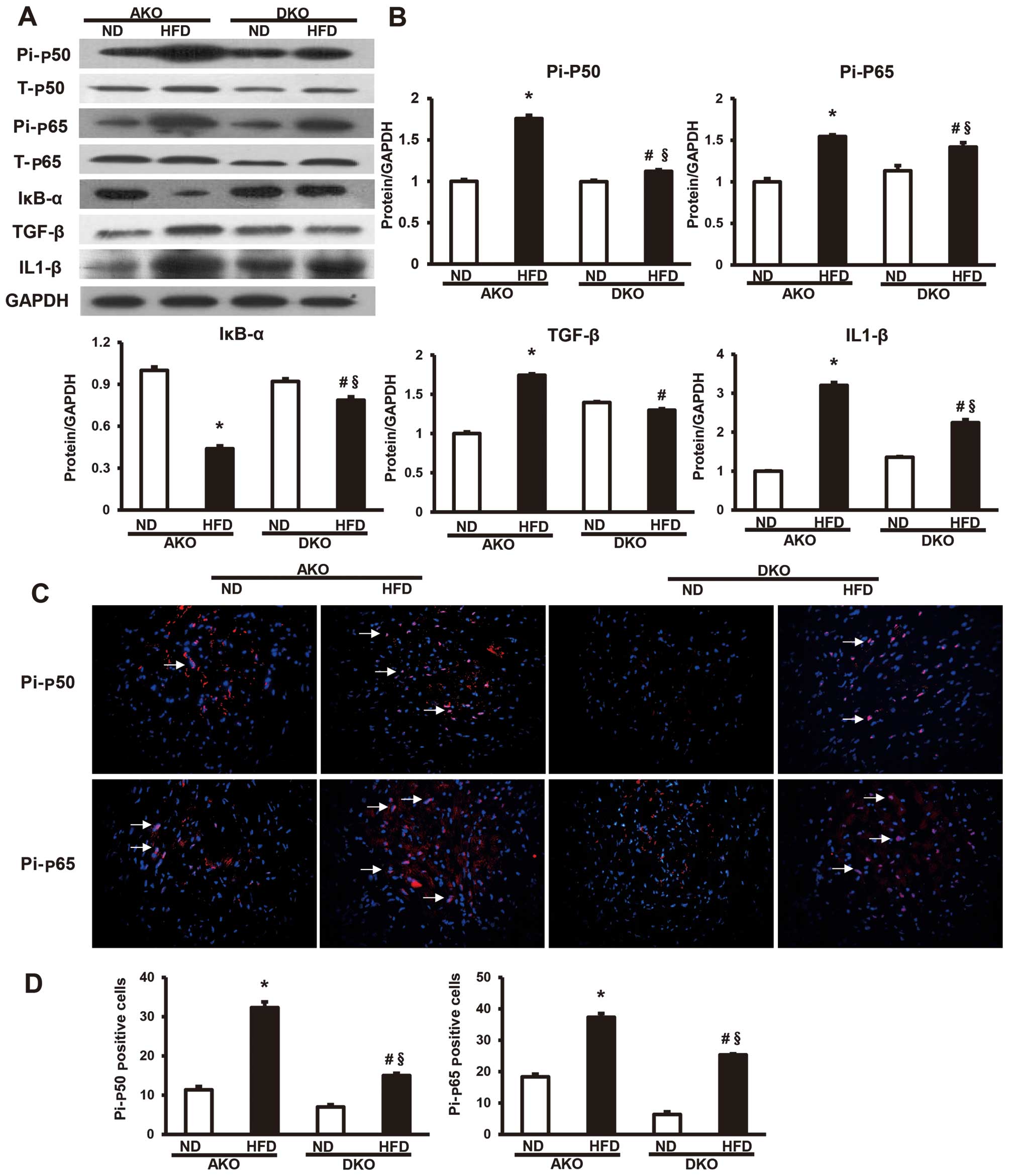 To investigate the regulatory mechanisms of IKKɛ in animal models, we examined the levels of p50, p65, IκB-α and the NF-κB pathway downstream factor (TGF-β, IL-β) proteins in hearts. By western blot analysis, the expression levels of total-p50 (T-p50) and total-p65 (T-p65), two important components that usually form the most common heterodimers of NF-κB, were shown not to be different between ApoE(−/−)/IKKɛ(−/−) and ApoE(−/−) murine groups (Fig. 4A). However, phosphorylated p50 (Pi-p50) and phosphorylated p65 (Pi-p65), comprising the functionally active form of the transcription factor in the nucleus, and IκB-α, which binds with NF-κB to inhibit its activation, were also detected (Fig. 4A). The results showed that the expression of Pi-p50 and Pi-p65 (Fig. 4A) were significantly higher in the ApoE(−/−) group compared to the ApoE(−/−)/IKKɛ(−/−) group after 12 weeks HFD feeding, while the expression pattern of IκB-α (Fig. 4A) was reversed among the four groups of mice. The protein expression of IκB-α was highly increased in the HFD-fed ApoE(−/−)/IKKɛ(−/−) group compared to the ApoE(−/−) group, while that of the other two groups of mice remained at the same level. In addition, the protein expression of the NF-κB pathway downstream factors, TGF-β and IL-β, were also downregulated in the HFD-fed ApoE(−/−)/IKKɛ(−/−) group compared with the ApoE(−/−) group (Fig. 4B).