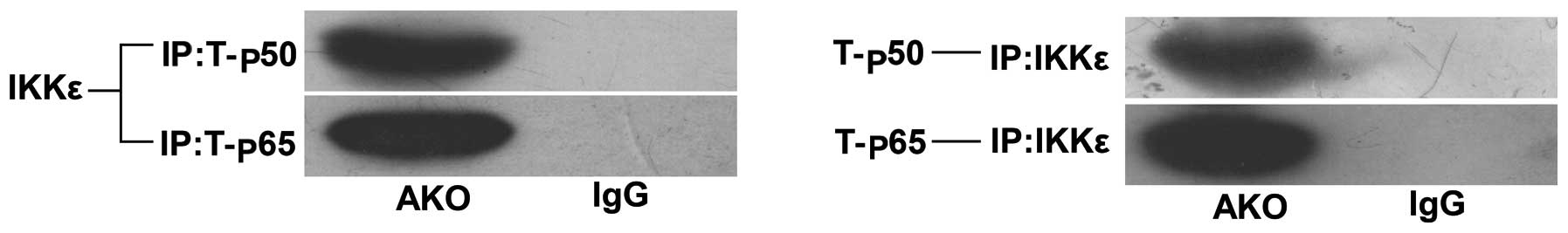 To identify the molecular mechanisms underlying the positive effects of IKKɛ on inflammatory response, we determined whether IKKɛ directly interacted with the T-p50/p65 heterodimer by immunoprecipitation experiments. The results showed that IKKɛ co-precipitated along with T-p50 and T-p65 (Fig. 5), which map IKKɛ. Additionally, the NF-κB pathway mediated the interaction during inflammation. This interaction suggested that expression levels of the NF-κB pathway were significantly correlated with IKKɛ activation.