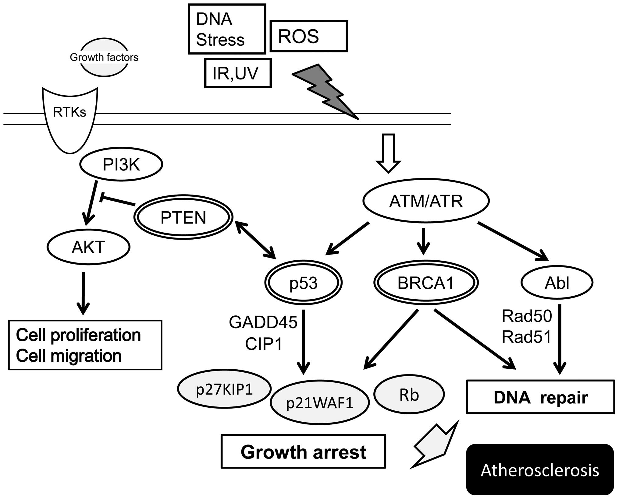 The residue-specific phosphorylation profile of the retinoblastoma tumor suppressor (Rb) appears to differ between the internal mammary artery and coronary artery (28). The differential profile of Rb phosphorylation may be a consequence of variances in the content of the CDK2 and CDK4 phosphorylation inhibitor, p15INK4. siRNA-mediated CDK2 knockdown modifies the profile of Rb phosphorylation in VSMCs of the coronary artery, as well as the proliferative response of these cells to mitogenic stimulation (28,29). The intrinsic functional and protein composition specificity of the VSMC population in the coronary artery may contribute to the increased incidence of atherosclerosis in the arteries. In fact, foam cell formation is induced through increased Rb phosphorylation (30). Apolipoprotein E (ApoE)-deficient mice lacking macrophage Rb display accelerated atherosclerosis coinciding with increased macrophage proliferation, suggesting that macrophage Rb is a suppressive factor in the progression of atherosclerosis by reducing macrophage cell proliferation (31). The phosphatase and tensin homolog deleted on chromosome 10 (PTEN)/AKT signaling pathway has also been implicated in the pathogenesis of vascular diseases. PTEN is a dual-specificity phosphatase that has been shown to inhibit VSMC proliferation and migration (32). Genetic research has demonstrted that the PTEN gene is critical to the pathological development of atherosclerosis (33). In addition, elevated PTEN expression and concomitant AKT inactivation have been observed in the endothelium of atherosclerotic arteries (34). The PTEN pathway may be important in the regulation of the inflammatory response in VSMCs. The tumor suppressor breast cancer 1, early onset (BRCA1) gene implicated in the development of breast and ovarian cancers exerts multiple effects on DNA repair and affords resistance against cellular stress responses (35), which is basally expressed in endothelial cells. BRCA1 may be a gatekeeper of inflammation-induced endothelial cell function (36,37). Whereas BRCA1 silencing exaggerates inflammation-induced endothelial cell apoptosis, BRCA1 overexpression protects cells againts this. BRCA1 overexpression intensely attenuates the production of ROS, upregulating endothelial nitric oxide synthase and vascular endothelial growth factor expression. BRCA1 expression is attenuated in the plaque region of human atherosclerotic arteries. It has been shown that single nucleotide polymorphisms (SNPs) in the BRCA1-associated protein (BRAP) gene are associasted with the risk of myocardial infarction in a large cohort (38).