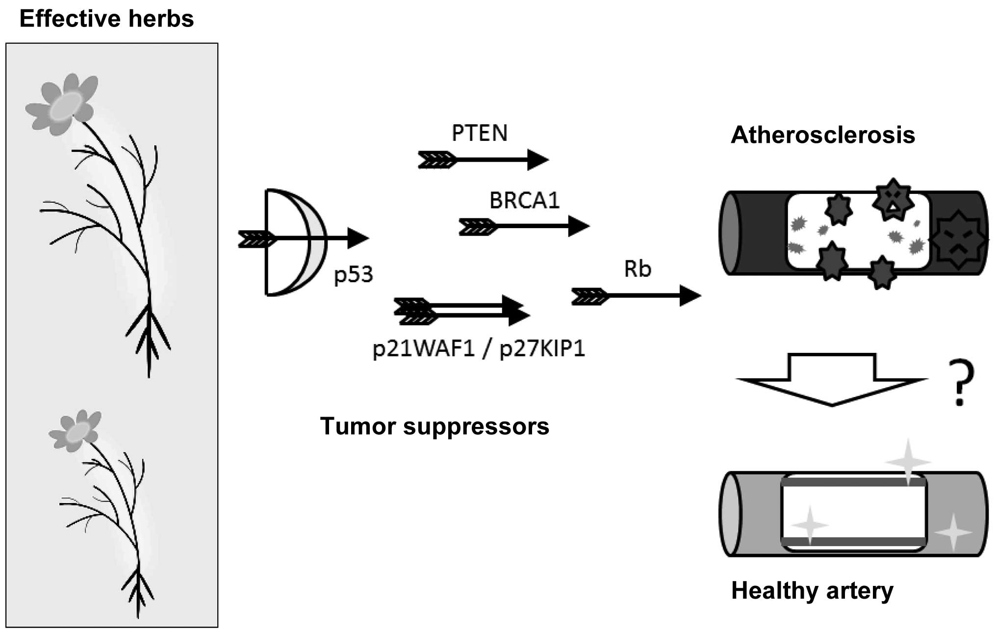 Atherosclerosis is likely to dominate clinical practice for decades. The information presented herein may provide further insight into the molecular mechanisms underlying the clinical use of herbs as a therapy for atherosclerosis. The identification of target molecules relevant for atherosclerosis allows screening for natural products capable of modulating targets. This may also represent the basis for the development of rational dietary treatment of other diseases. Future studies are required to demonstrate whether tumor suppressors and/or their downstream targets can be used to modulate the cellular composition of plaques, thereby enhancing plaque stability. Atherosclerosis is caused by a number of factors, including oxidative stress which increases sphingomyelinase and ceramides correlated with the level of ox-LDL (83). During atherogenesis, ROS are formed, resulting in oxidative DNA damage which is followed by increased DNA repair activity so that initial damage is effectively repaired. Tumor suppressors are key molecules at this point. Further studies are required to elucidate the potential roles of damaged DNA in the pathogenesis of atherosclerosis. Further understanding of the local determinants of the phenotype of endothelial cells in the lesion and how they interact with atherosclerosis risk factors may lead to a notable improvement in therapies.