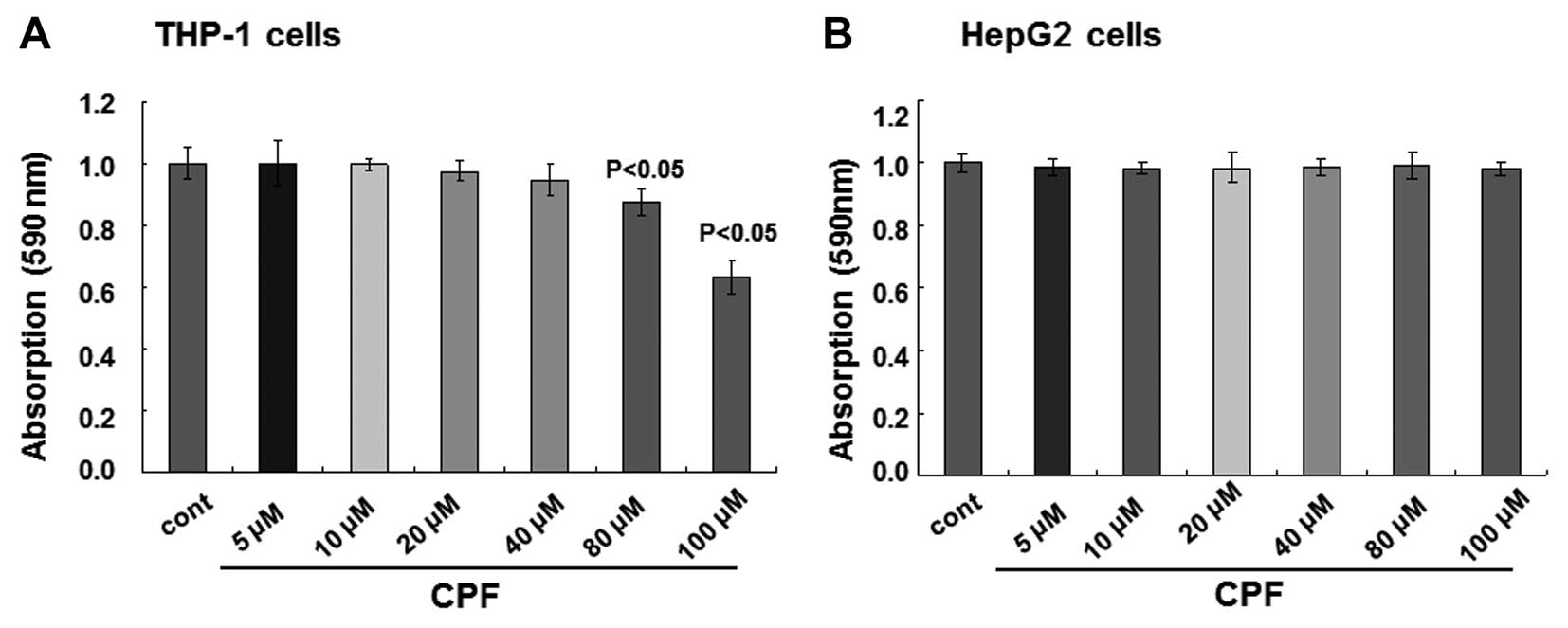 Cell viability was determined through the Alamar blue assay according to the manufacturer’s instructions (Thermo Fisher Scientific, Inc.). Briefly, THP-1 and HepG2 cells were seeded in 96-well plates at a concentration of 5.0×103 cells/well. The cells were then treated with CPF for 24 h, followed by emission detection at 590 nm with excitation at 530 nm.