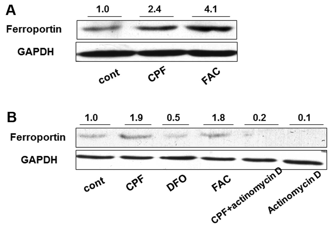 Cells were harvested and washed twice with cold phosphate-buffered saline (PBS). Total proteins were then extracted with RIPA lysis buffer (Solarbio, Beijing, China) supplemented with protease inhibitor cocktail (Roche Applied Science, San Francisco, CA, USA). Equal amounts of protein lysates (30–50 μg/sample) were subjected to 10% SDS-PAGE and western blot analysis was performed as described previously (24). Antibodies included anti-ferroprotin (1:500; Sigma-Aldrich, St. Louis, MO, USA) and anti-glyceraldehyde 3-phosphate dehydrogenase (GAPDH) (1:1,000; Santa Cruz Biotechnology, Inc., Santa Cruz, CA, USA). Intensity of bands was assessed with the ImageJ software (http://rsb.info.nih.gov/ij/). GAPDH was used as an internal control for normalization.