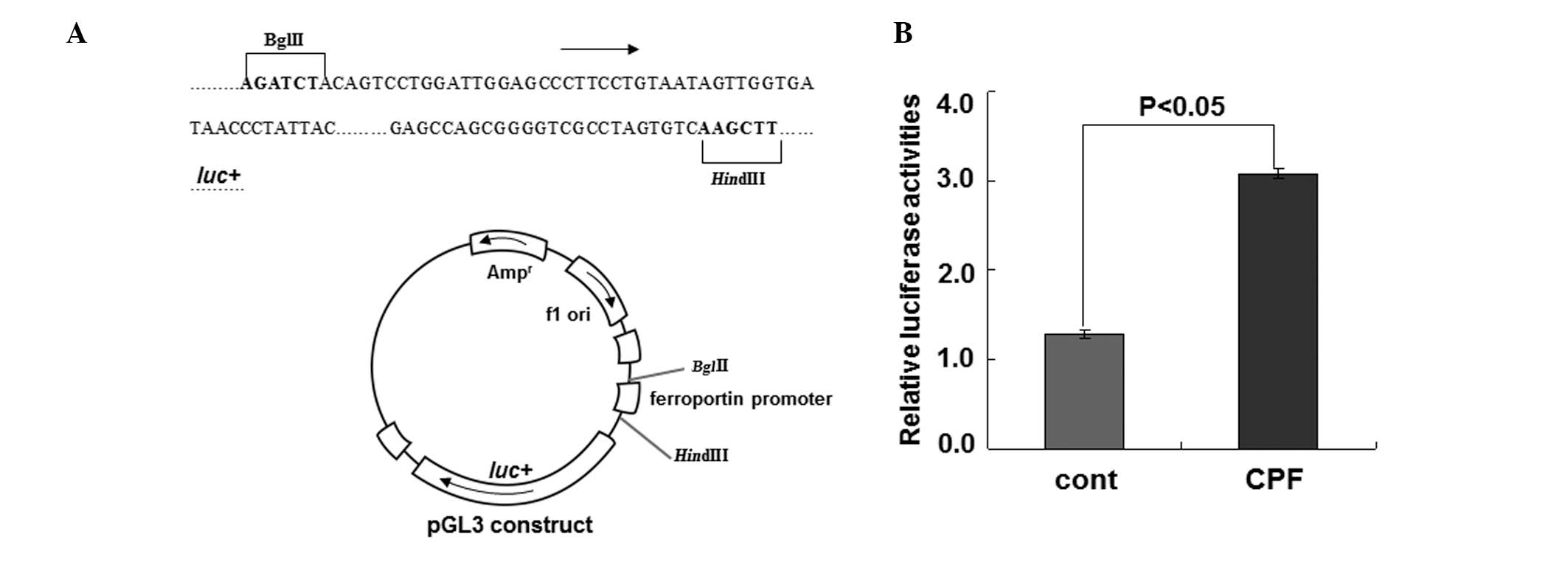 To substantiate the regulation of ferroportin by CPF at the transcriptional level, we performed the luciferase reporter assay to examine ferroportin expression driven by its own promoter upon CPF (Fig. 3). Following exposure to CFP at 20 μM for 24 h in HEK293T cells, luciferase activity was measured. Compared to the control, CPF treatment increased luciferase activity by ~2.5-fold (P<0.05) (Fig. 3), supporting the transcriptional regulation of ferroportin by CPF. These data together identified a novel effect of CPF on promoting ferroportin expression in macrophages.