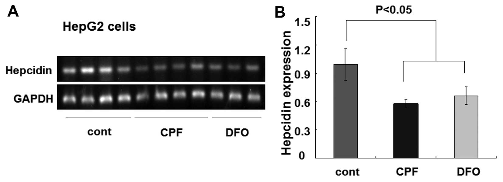 To understand the biological effects of CPF on iron metabolism, hepatic hepcidin expression was investigated. As the master regulator of systemic iron homeostasis, hepcidin is predominantly secreted by hepatocytes (31). Additionally, hepcidin directs iron flow by suppressing ferroportin-conducted iron release (32). Hepcidin reduction is associated with increased iron egress and intracellular iron depletion. HepG2 cells were similarly treated with CPF at 20 μM. After 24 h, we found that the hepcidin mRNA level was greatly reduced by CPF (Fig. 4A). The quantified data showed an ~50% reduction of the hepcidin mRNA level in CPF-treated cells relative to the untreated cells (P<0.05) (Fig. 4B). Consistent with previous studies (33), DFO was used as a control to inhibit hepcidin expression (P<0.05) (Fig. 4). These results demonstrated a considerable inhibitory effect of CPF on hepatic hepcidin expression.