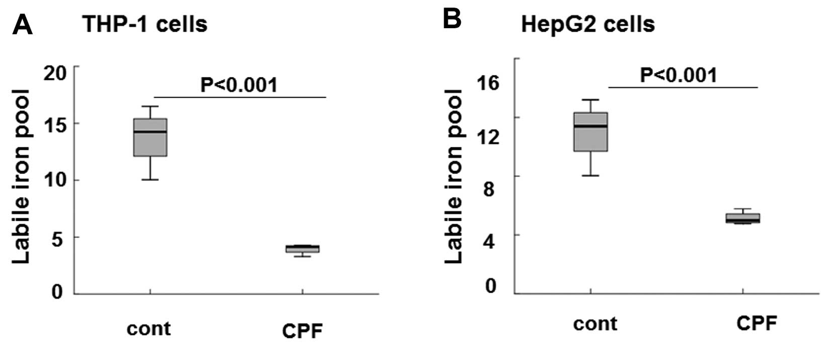 The available section of intercellular iron occurred in loosely-bound divalent iron form (i.e., LIP). It was readily and rapidly involved in the synthesis of iron-sulfur clusters, heme and other iron-containing proteins (34,35). LIP was largely determined by the concentrations of iron exporter ferroportin and iron-storage protein ferritin (35). Thus, the intracellular iron concentration was sensitively reflected by the availability and abundance of cellular LIP. To elucidate the consequential effects on iron storage following CPF exposure in THP-1 and HepG2 cells, we assayed LIP in the two types of cells following CPF treatment at 20 μM for 24 h. As shown in Fig. 5A the level of intracellular LIP was markedly reduced by ~3-fold in THP-1 cells in CPF-treated cells relative to the untreated cells (P<0.001), consistent with the significant induction of ferroportin subsequent to CPF treatment (Fig. 2). The level of intracellular LIP was greatly reduced by >2-fold in HepG2 cells treated with CPF compared to the untreated cells (Fig. 5B) (P<0.001), concomitant to hepcidin reduction in these cells following CPF (Fig. 4). These data signified the biological consequences of CPF on iron flow in macrophages and hepatocytes, by modulating ferroportin and hepcidin expression, respectively.