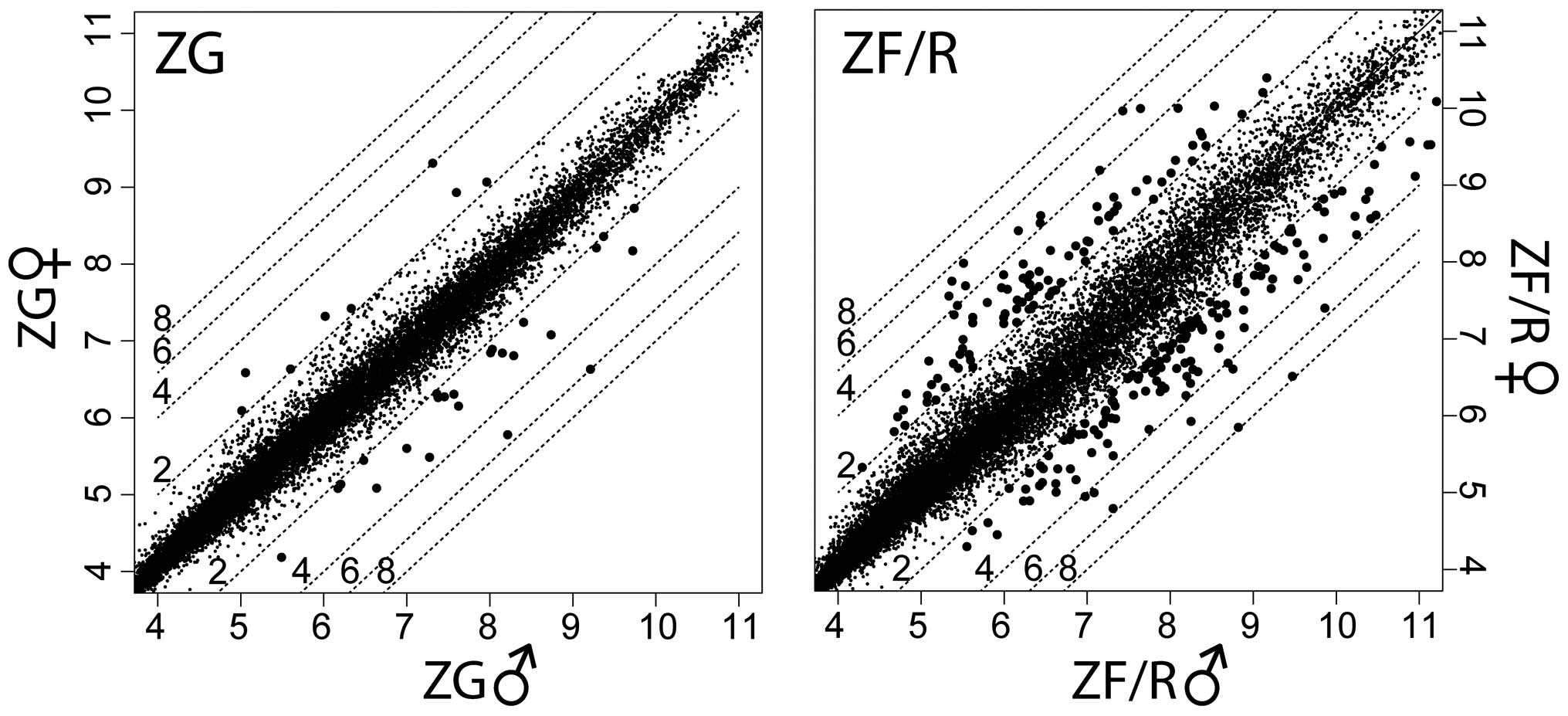 We also identified transcripts with differential expression in the ZG and ZF/R of adult male and female rats (Fig. 2). In male rats, compared to the ZF/R, in the ZG 448 genes were upregulated and 123 downregulated. In females, these figures were 519 and 183, respectively.