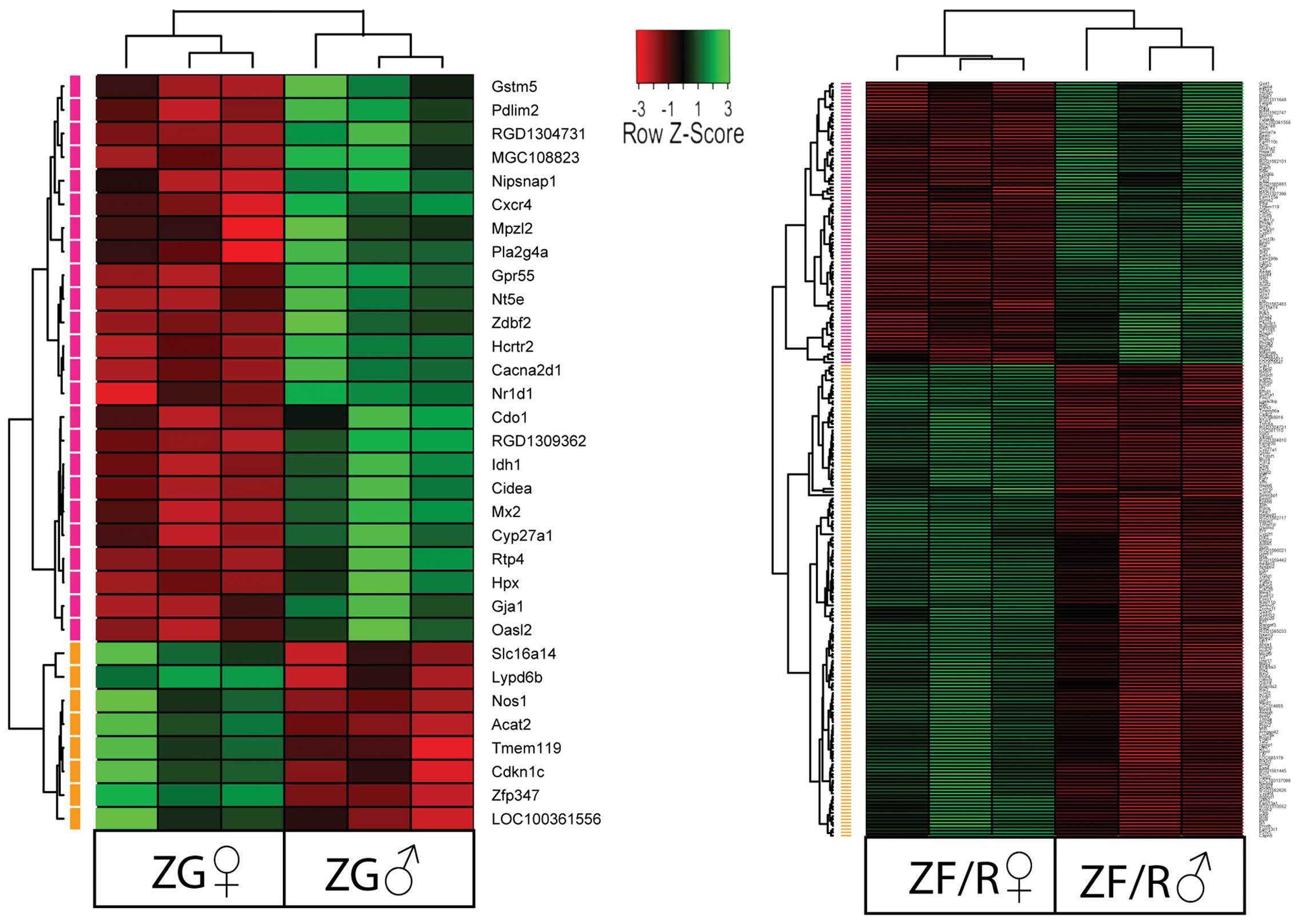 Each of the raw expression values from gender-specific genes was grouped using a hierarchical clustering algorithm. The results of this analysis are presented as a heat map (Fig. 3). The clustering confirmed that in the ZG, the expression levels of 24 genes were lower and 8 were higher in the female rats and the symbols of these genes are shown. The same applied to the ZF/R; however, in this compartment, the expression levels of 146 genes were lower and those of 87 genes were higher in the female rats.