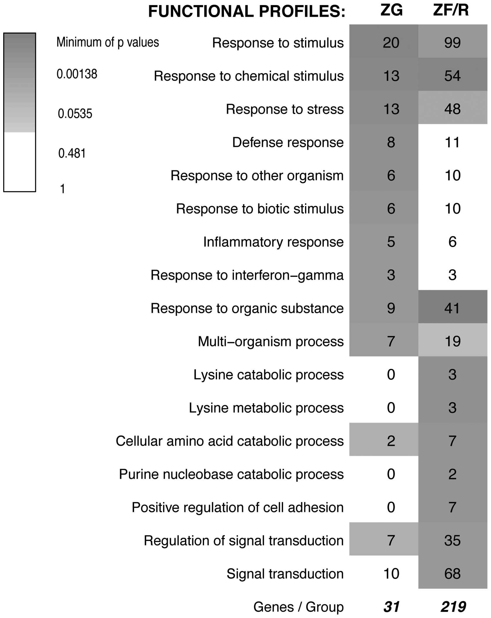 The DAVID system is a powerful tool that allows us to discover enriched functionally related gene groups and to cluster similar annotation terms. This system extracts data from numerous databases and, as evidenced by the Science Citation Index, this system is gaining wide popularity among molecular biologists. We performed separate analyses for the ZG and ZF/R. For the ZG, with the selected cut-off value (p<0.05), 3 annotation clusters were obtained (ordered by enrichment score) (Table II). On the other hand, for the ZF/R 5 clusters were obtained. All clusters (ZG and ZF/R) combined 516 genes (counts). This figure indicated that numerous genes participated in more than one annotation cluster. In the ZG 90 counts were either up- or downregulated, while in the ZF/R the number of counts was notably higher, i.e., 426.