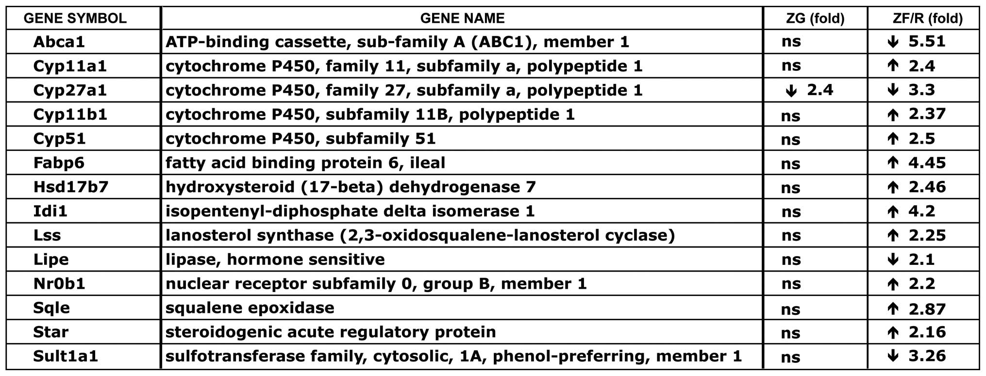 Furthermore, analyses of ZF/R genes represented in cluster 1, subcluster ‘steroid metabolism process’ (from Table II) revealed numerous genes, the expression levels of which were different in the ZF/R (Fig. 6). Of these genes, the expression levels of only 4 of them [ATP-binding cassette, sub-family A (ABC1), member 1 (Abca1), cytochrome P450, family 27, subfamily A, polypeptide 1 (Cyp27a1), lipase, hormone-sensitive (Lipe) and Sult1a1] were lower in the females compared to the males. On the contrary, the remaining genes exhibited higher expression levels in the females [Cyp11a1, cytochrome P450, family 11, subfamily B, polypeptide 1 (Cyp11b1), cytochrome P450, family 51 (Cyp51), fatty acid binding protein 6, ileal (Fabp6), hydroxysteroid (17-beta) dehydrogenase 7 (Hsd17b7), isopentenyl-diphosphate delta isomerase 1 (Idi1), lanosterol synthase (2,3-oxidosqualene-lanosterol cyclase) (Lss), Nr0b1, squalene epoxidase (Sqle) and steroidogenic acute regulatory protein (Star)].