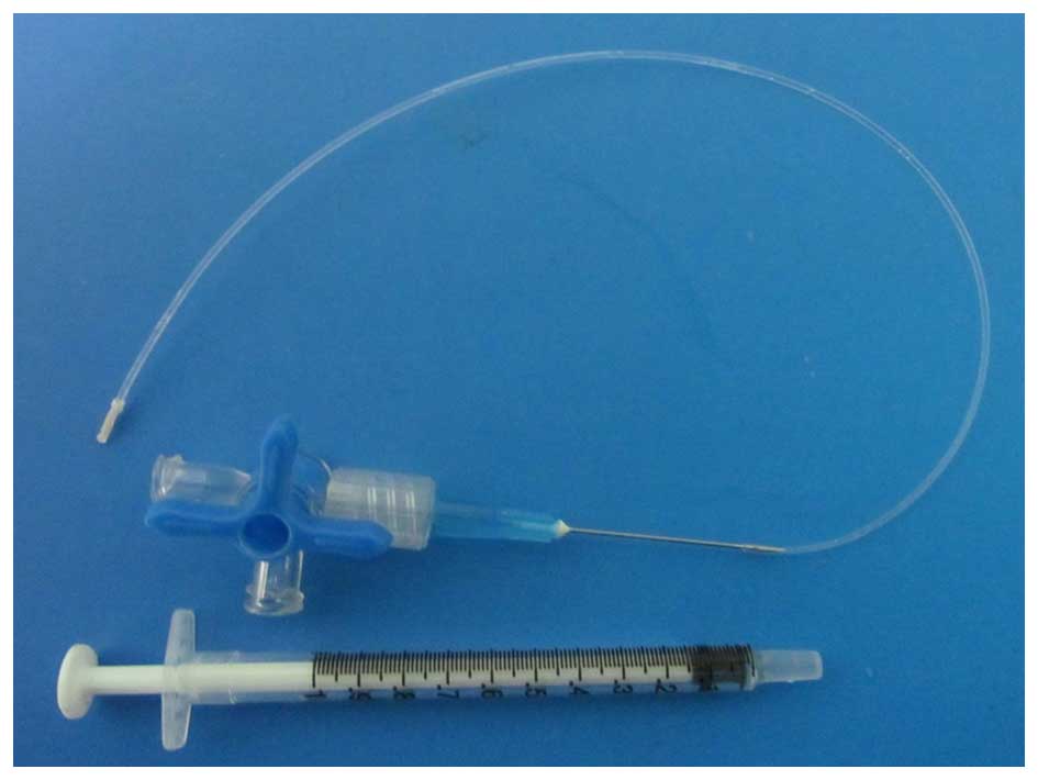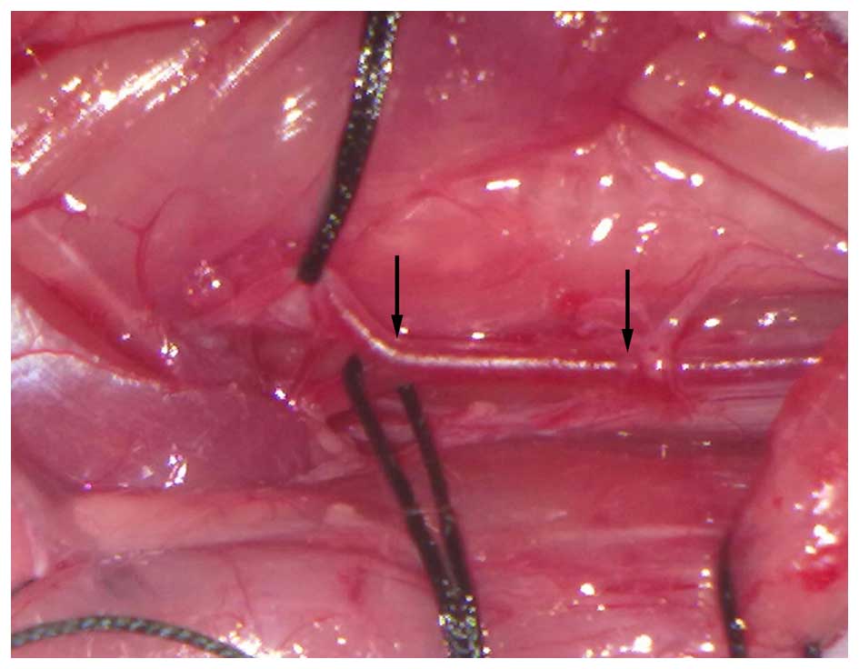 Subsequent to intraperitoneal anesthesia with urethane (1,000 mg/kg), an operating microscope was used to separate the carotid artery (CA). A right CA intima injury was created according to an approach described in a previous intervention project (15). Specific equipment (stereotactic head frame) was designed and manufactured by the experimental group members. In addition, a catheter and balloon were purchased from Medtronic Inc. and manufactured by the authors of this study. A T-branch pipe and 1-ml syringe were used to modulate the size and pressure of the balloon. The mode pattern is shown in Fig. 1. Briefly, the catheter was inserted through the external CA and slipped into the common CA, where it was inflated to ~2 atm and the inner surface of the common CA was rubbed back and forth three times. The catheter was then removed and the impaired external CA was carefully sutured by using a 12-0 proline under the operating microscope (M651; Leica Microsystems) to prevent the impaired ECA from developing a ligature. A 2-cm common CA region adjacent to the common CA intersection was then cut for this experiment. The vasal site and obtained segment of the injured CA were marked by two black arrows (Fig. 2).