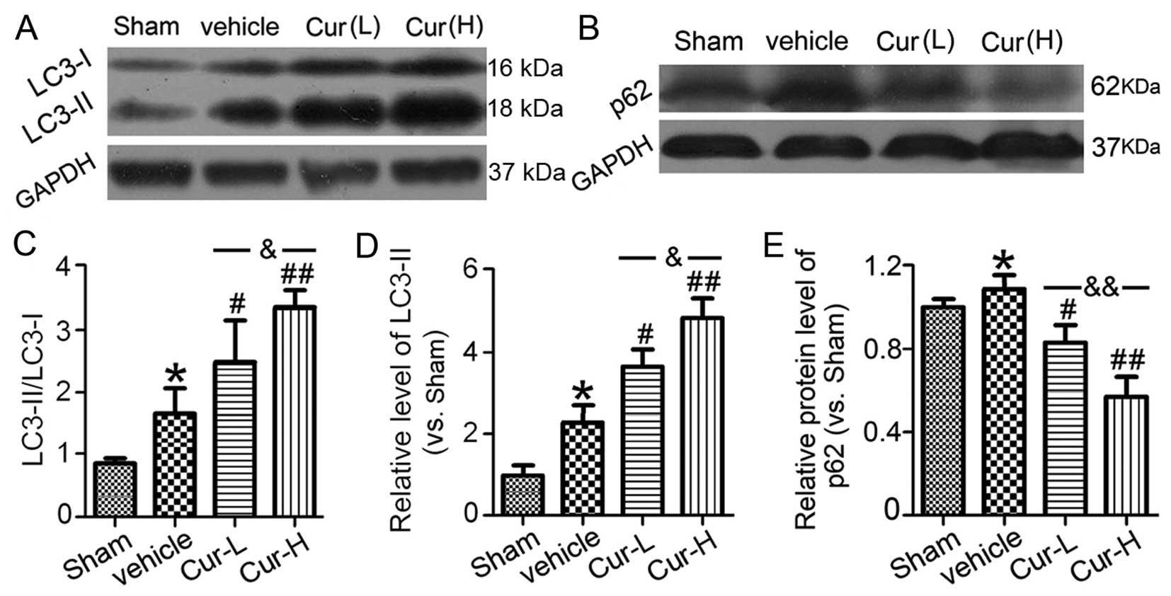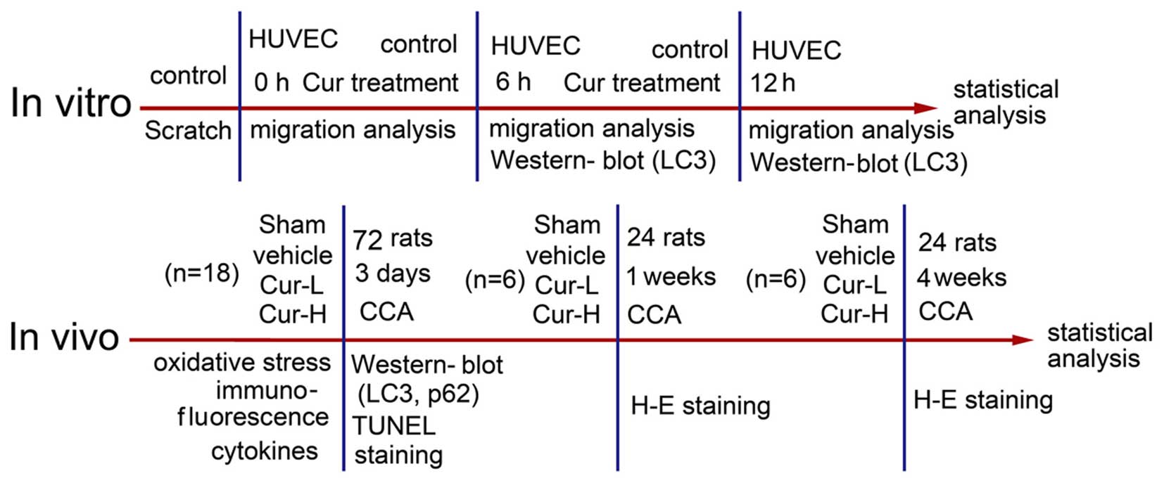 Cur was extracted from Curcuma longa (Bailingwei Technology Co., Ltd., Beijing, China, SB-431542). The rabbit polyclonal antibody against LC3-A/B (ab58610) and the mouse monoclonal antibody against p62 (610833) were purchased from BD Biosciences (Palo Alto, CA, USA) and the mouse monoclonal antibody against GAPDH (sc-365062) was from Santa Cruz Biotechnology, Inc. (Santa Cruz, CA, USA). The FOX3-vWF rabbit polyclonal and mouse monoclonal antibody-endothelial cell marker (ab6994 and ab68545) were from Abcam (New Territories, Shatin, Hong Kong). Secondary antibodies for western blot analysis, which included goat anti-rabbit IgG-HRP (sc-2004) and goat anti-mouse IgG-HRP (sc-2005) were purchased from Santa Cruz Biotechnology, Inc.. Normal rabbit IgG (sc-2027) was from Santa Cruz Biotechnology, Inc. Secondary antibodies for immunofluorescence, including Alexa Fluor-488 donkey anti-rabbit IgG antibody (A21206) and Alexa Fluor-555 donkey anti-mouse IgG antibody (A31570) were from Invitrogen-Life Technologies (Carlsbad, CA, USA).