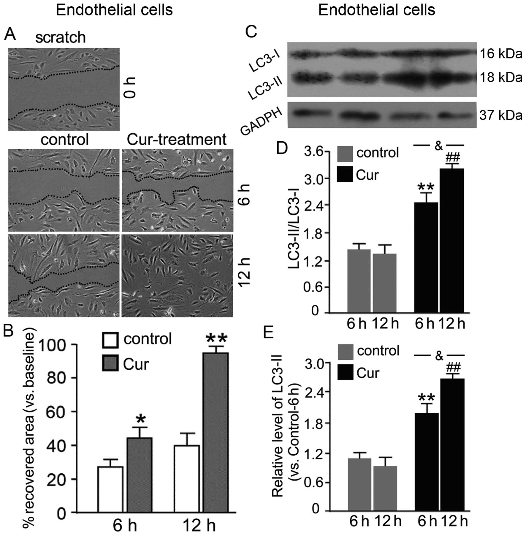 As shown in Fig. 4A and B, a comparison of recovered areas showed that Cur accelerated the closure of an artificial wound at 6 and 12 h after experimental induction of the wound compared to the control (P<0.05 and P<0.01, respectively). Simultaneously, as shown in Fig. 4C–E, wherein treated control-6 h was used as a standard, Cur increased the expression of LC3-II and the ratio of LC3-II/LC3-I when HUVECs were exposed to Cur, indicating that Cur induced autophagy in CAs at 6 and 12 h (P<0.05 and P<0.01, respectively). Moreover, the expression of LC3-II and the ratio of LC3-II/LC3-I were upregulated following 12 h compared to that observed in the 6 h group (P<0.05).