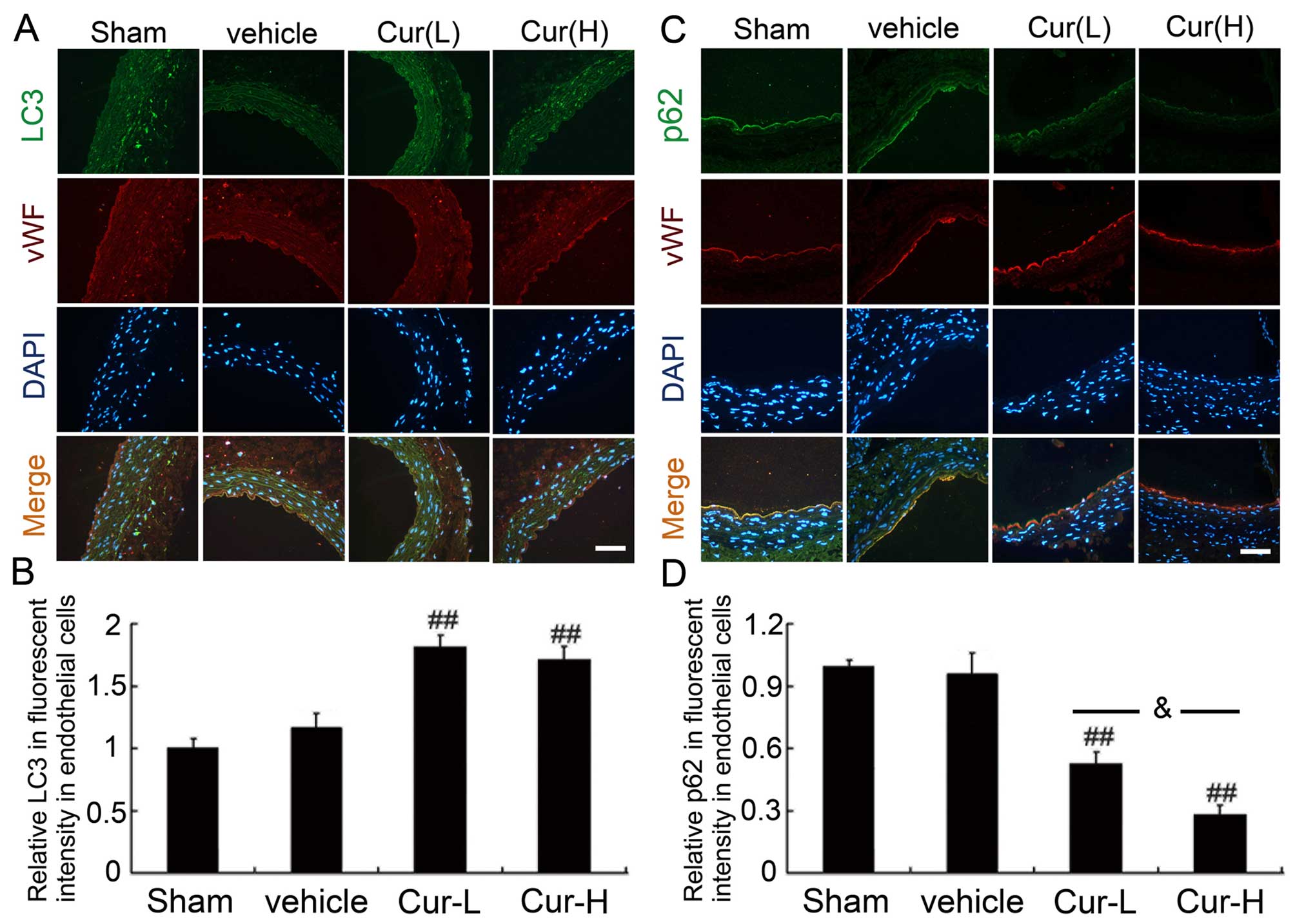 To investigate the autophagy-promoting role of Cur, the autophagic levels of HUVECs from various treatment groups were evaluated by detecting LC3-II accumulation and calculating for the ratio of LC-I/LC3-II in western blot analysis (Fig. 5). The LC3-II level and the ratio of LC3-II/LC3-I slightly increased compared to that observed in the sham group (P<0.05). Cur upregulated LC3-II and the ratio of LC3-II/LC3-I, indicating that Cur induced autophagy in CAs (P<0.05 and P<0.01, respectively). However, Cur treatment also markedly suppressed p62 expression (P<0.05 and P<0.01, respectively), whose level was negatively correlated with the autophagic standard. Accordingly, to distinguish the cell identity for LC3 and p62, double-immunofluorescence staining with vWF was performed on vascular sections attached to different groups (Fig. 6). A less diffuse cell staining of LC3-I was observed in the sham group, whereas a more punctate staining for LC3-II was observed in the injured group compared to that observed in the sham group. However, Cur treatment resulted in a significant increase in punctate staining compared to that observed in the sham and injured groups (P<0.01). An increase in p62 fluorescence intensity was detected after vascular injury, which may have been restrained by Cur (P<0.01). Nonetheless, the high dose of Cur apparently added an extra effect to low-dose Cur (P<0.05).