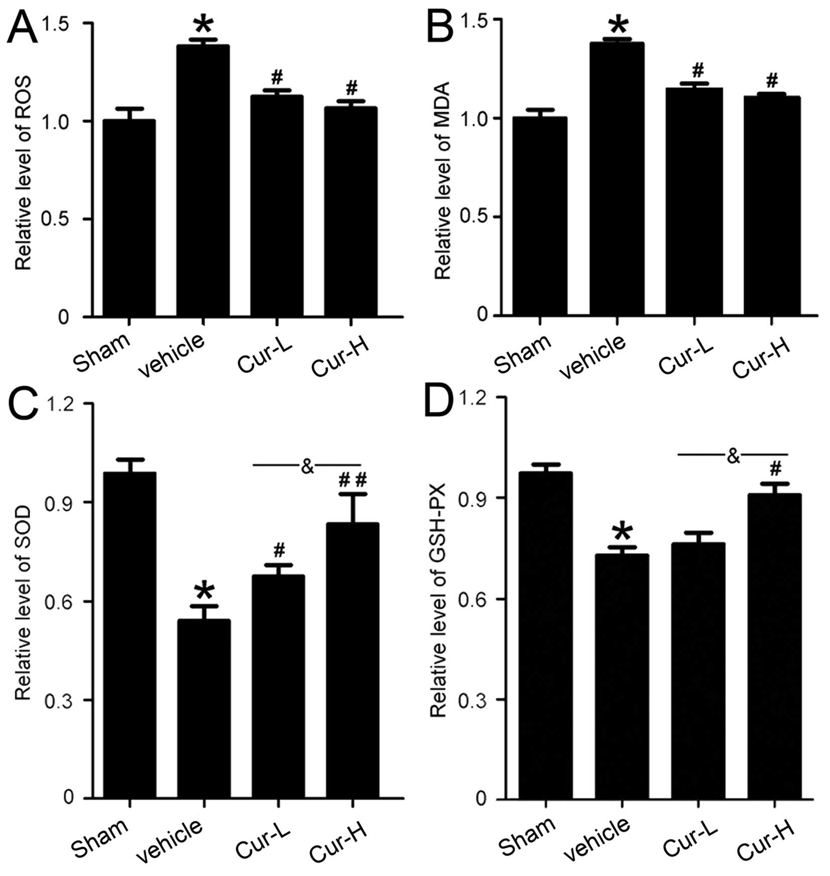 To assess the effect of Cur on oxidative stress following CA intimal injury, we detected the levels of ROS and MDA and the activities of GSH-Px and SOD in rat CA tissues. As shown in Fig. 7, compared to the sham group, the levels of ROS (P<0.05) and MDA (P<0.05) were significantly elevated, whereas that of GSH-Px (P<0.01) and SOD (P<0.05) decreased. However, Cur treatment restrained the elevation of the levels of ROS (P<0.05) and MDA (P<0.05) and reversed the reduction of SOD (P<0.05 and P<0.01, respectively) and GSH-Px (P<0.05) activities following balloon injury. These findings showed that high-dose Cur suppressed the downregulation of SOD (P<0.05) and GSH-Px (P<0.05) activities. These results are suggestive of the antioxidant action of Cur.