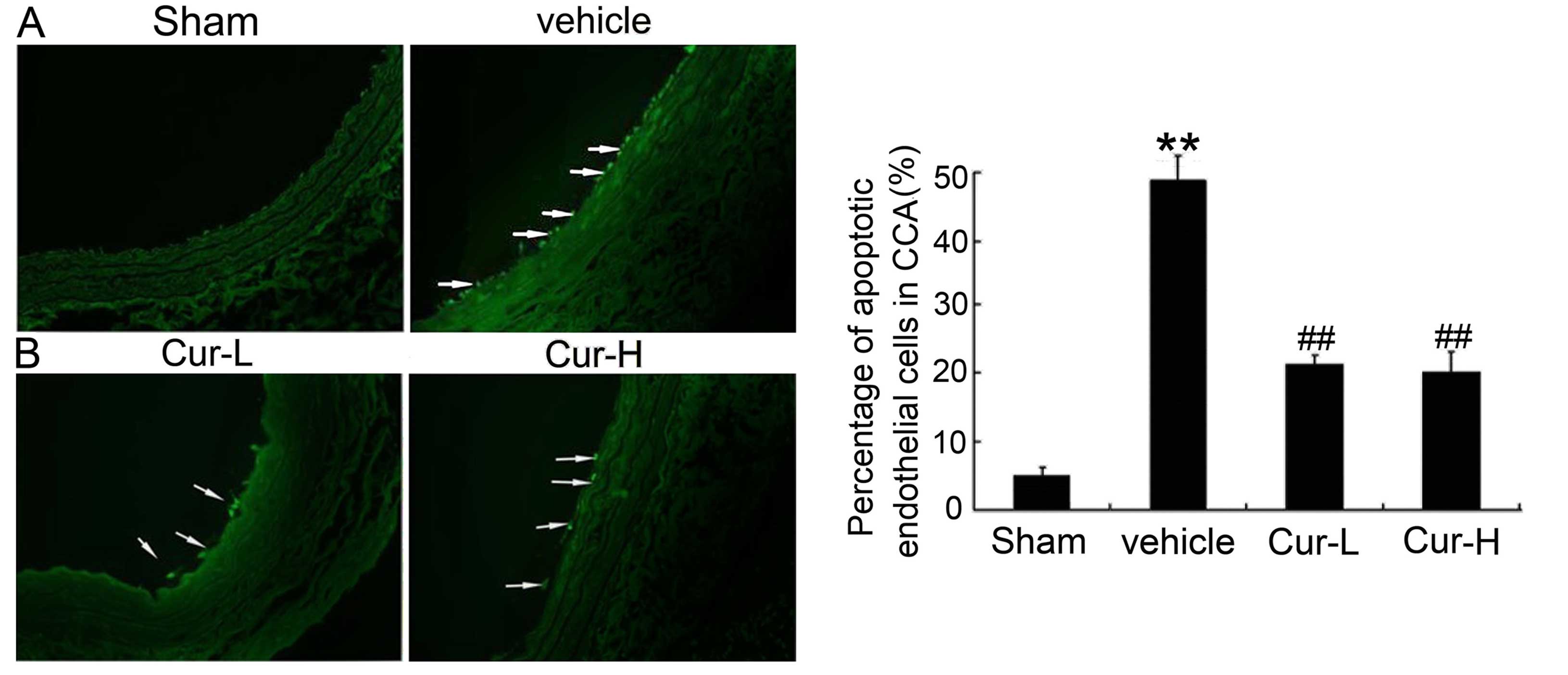 As shown in Fig. 8A, only a few TUNEL-positive apoptotic cells were identified in the endothelium of CA in the sham group, whereas the apoptotic index was significantly higher in the injured group (P<0.01). Compared to the injured group, low-dosage Cur or high-dosage Cur imparted a obvious protection effect on vascular EC apoptosis (P<0.01).