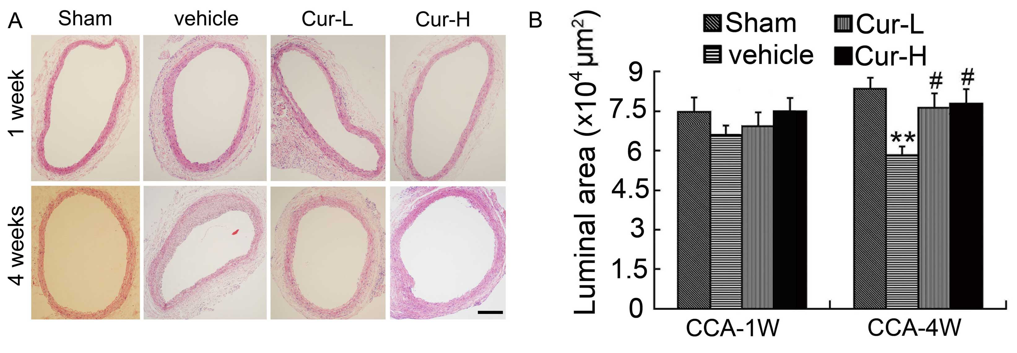 A significant hemadostenosis or plaque was not detected in the injured and treatment groups at 1 week after injury, wherein the neointima remained fairly stable in size (Fig. 9A). The rats subjected to balloon injury of the CA after 4 weeks developed a reproducible IH response (Fig. 9A). A significant difference in the luminal area between the injured and Cur treatment groups was observed (Fig. 9B). In rats that were treated with daily Cur treatments for 4 weeks, the luminal area of CA was significantly reduced compared to that observed in the sham vessels (P<0.01). Cur-treated CA showed a significant suppression of IH formation compared to that observed in the injured group (P<0.05). However, no amelioration of neointima size and thickness was observed in the high-dose Cur group compared to that observed in the low-dose Cur group.