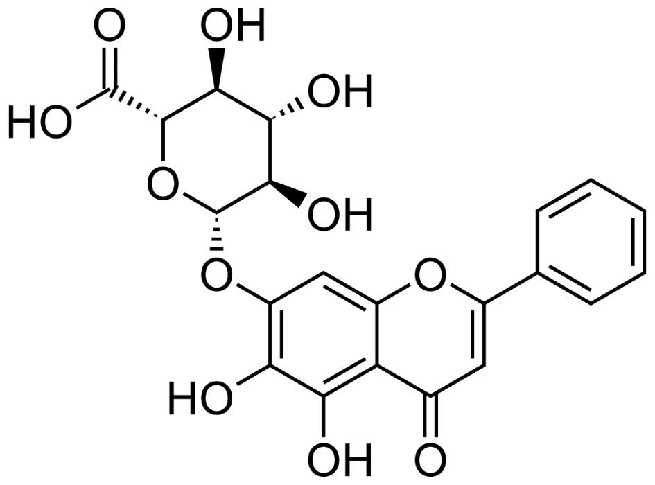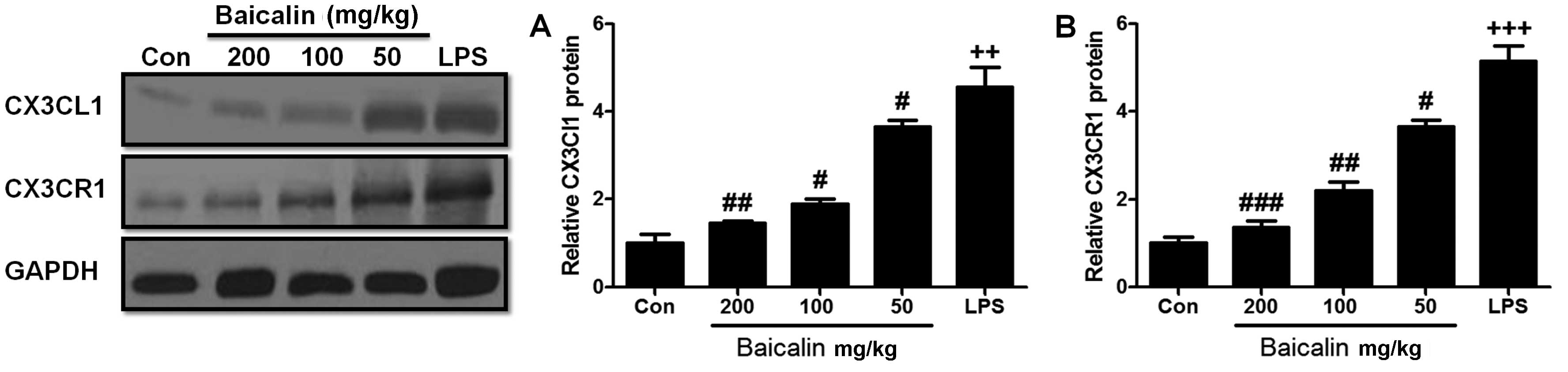 Baicalin (CAS: 21967-41-9, HPLC analysis ≥98%, C21H18O11, MW: 446.36102) was purchased from the National Institute for the Control of Pharmaceutical and Biological Products (Beijing, China) (chemical strucure shown in Fig. 1). LPS was obtained from Sigma-Aldrich China, Inc. (Shanghai, China) and prepared in phosphate-buffered saline (PBS) at the concentration of 100 µg/ml. Anti-CX3CL1 (rabbit; ab25088) and anti-CX3CR1 (rabbit; ab8021) antibodies were obtained from Abcam (Shanghai, China). Anti-AKT (rabbit; 4961), anti-phosphorylated (p-) AKT (rabbit; 9614), anti-IκB (rabbit; 4812), anti-p-IκB (rabbit; 5209), anti-NF-κB (rabbit; 8242), anti-p-NF-κB (rabbit; 3033), anti-cyclooxygenase-2 (COX-2; rabbit; 12282) and anti-p-IKKβ (rabbit; 14938) antibodies were all obtained from Cell Signaling Technology, Inc. (Beverly, MA, USA). The tumor necrosis factor (TNF)-α, interleukin (IL)-1β, IL-6 and transforming growth factor (TGF)-β ELISA kits were obtained from R&D Systems, Inc., (Minneapolis, MN, USA). The IL-18 kit was from BioLegend (San Diego, CA, USA). Male BALB/c mice (n=120; 6–8 weeks old, weighing 20–25 g) were obtained from Charles River Laboratories (Wilmington, MA, USA) and housed in a temperature and humidity-controlled environment (25±2°C and 50±10% humidity) with a standard 12-h light/dark cycle with food and water provided in the cages. This study was approved by the Ethics Committee on Animal Research at the Capital Medical University, Beijing, China. All mice were randomly divided into 5 groups as follows: i) the control group; ii) the group treated with 3 mg/kg LPS; iii) the group treated with 3 mg/kg LPS + 50 mg/kg baicalin; iv) the group treated with 3 mg/kg LPS + 100 mg/kg baicalin; and v) the group treated with 3 mg/kg LPS + 200 mg/kg baicalin. The mice were orally administered with the various concentrations of baicalin for 7 days prior to the administration of LPS. LPS was administered to the mice via intraperitoneal injection for 48 h. All animal experiments were performed in accordance with the guide for the Care and Use of Laboratory Animals established by the US National Institutes of Health. In addition, 70 male C57BL/6 mice (6–8 weeks old, weighing 20–25 g) lacking the CX3CL1 gene (CX3CL1-KO or CX3CL1−/−) and wild-type (WT) mice (6–8 weeks old, weighing 20–25 g) were purchased from Beijing Biocytogen Co., Ltd. (Beijing, China). The C57BL/6 mice and WT mice were administered LPS in the same manner as the BALB/c mice.