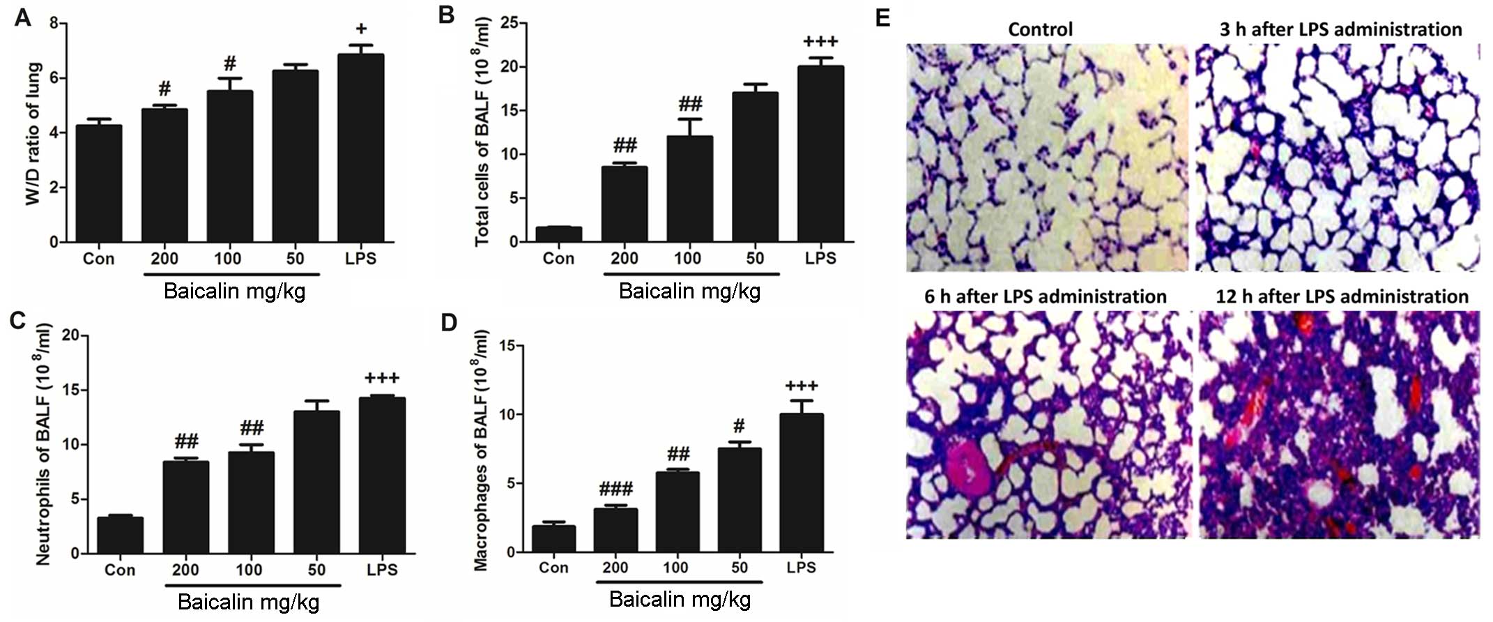 We wished to determine whether the administration of LPS affects the ratio of lung wet-to-dry weight. As shown in Fig. 2A, the administration of LPS induced a significant increase in the wet-to-dry ratio, compared to the untreated control group. But in baicalin treatment, it has ability to decrease the lung wet-to-dry ratio. However, baicalin inhibited the LPS-induced increase in the lung wet-to-dry weight in a dose-dependent manner. Furthermore, we also examined the effects of baicalin on inflammatory cell counts in BALF. As shown in Fig. 2B–D, treatment with various concentrations of baicalin decreased the number of inflammatory cells in BALF, including neutrophils and macrophages, which was increased following the administration of LPS. Baicalin decreased the number of inflammatory cells in BALF in a dose-dependent manner.