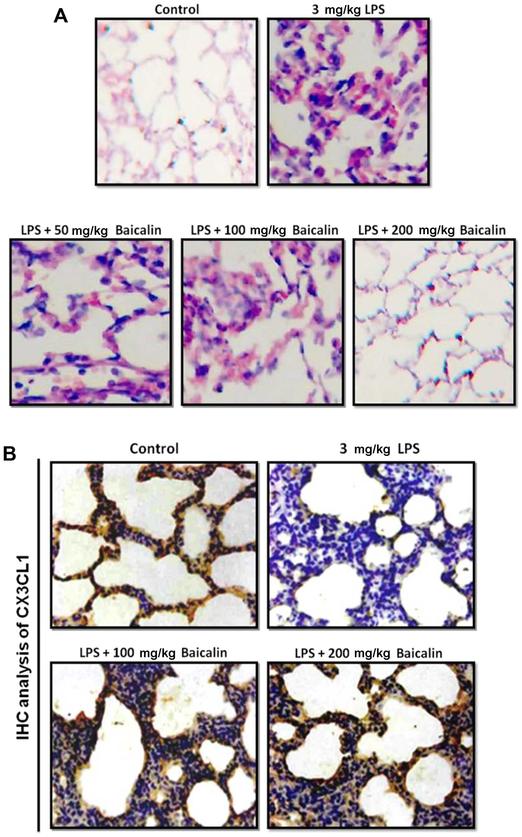 Histopathological evaluation was performed on the lungs of 8–10 mice that were not subjected to BALF collection. The lungs were fixed with 10% buffered formalin, imbedded in paraffin and sliced. Following hematoxylin and eosin (H&E) staining, the pathological changes of the lung tissues were observed under a light microscope. Some samples were also was subjected to immunohistochemical (IHC) staining (CX3CL1 and IκBα antibody) according to the instructions of the manufacturer (Cell Signaling Technology, Inc.) and were performed by Shanghai Zhenda Biotechnology, Co., Ltd. (Sanghai, China).