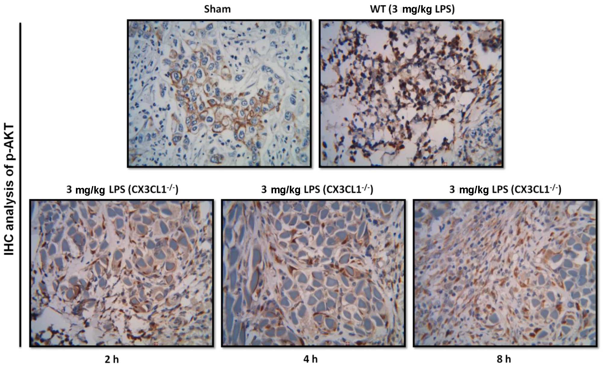 As shown in Figs. 9, 10 and 11, IHC analysis demonstrated that the AKT pathway was significantly activated following the administration of LPS. In the CX3CL1−/− mice, the phosphorylation levels of AKT were lower than those of the WT mice, and the inhibition of the AKT pathway in the CX3CL1−/− mice was observed in a time-dependent manner. In addition, the results of western blot analysis indicated that the AKT-induced activation of the TLR4/MyD88/NF-κB signaling pathway was significantly inhibited in the CX3CL1−/− mice compared with the WT mice. These findings suggest that the AKT pathway plays a role in the development of LPS-induced lung inflammation, which also directly involves the activation of the CX3CL1-CX3CR1 axis. The AKT-induced activation of the NF-κB signaling pathway was significantly inhibited in the CX3CL1−/− mice challenged with LPS.