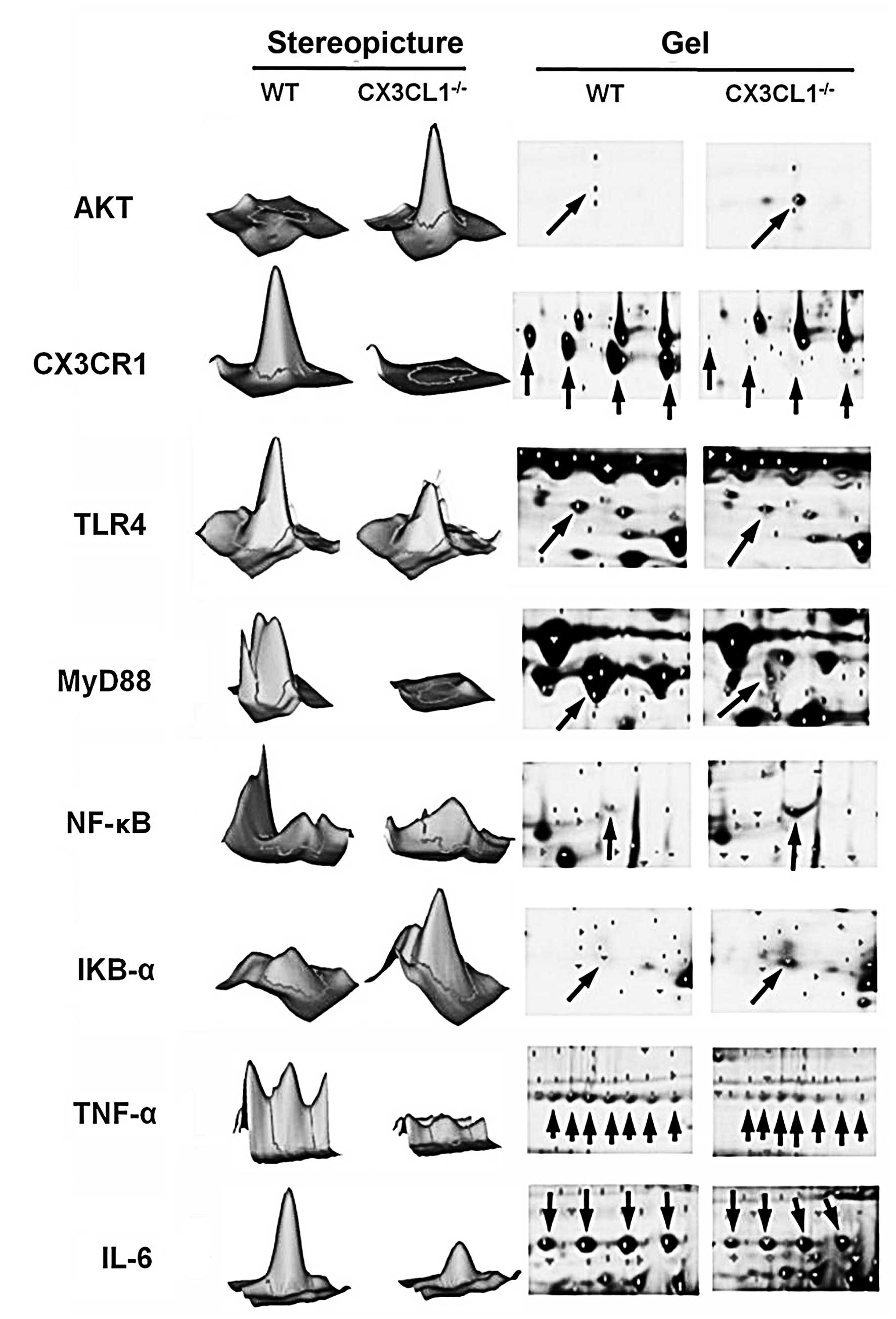 Each gel was loaded with 100 µg protein and mixed with water solution (7 mol/l urea, 2 M thiourea, 4% CHAPS and 0.2% ampholyte). The total sample volume was 290 µl. After hydration of the IPG adhesive strip (24 cm, pH 3–10, NL), the mineral oil was then covered. The isoelectric focusing procedure was set as 30 V/6 h→60 V/6 h→500 V/1 h→1,000 V/1 h→8,000 V/10 h, and the total voltage time product was 64,000 Vh. After isoelectric focusing, the IPG strip was preserved in the SDS equilibrium solution (6 M urea, 2% SDS, 0.02% bromophenol blue liquid reserves) for 15 min. After completion of the equilibrium, the IPG strip was placed above the 12.5% uniform polyacrylamide gel and 10 µl protein marker was added on the SDS gel. The air bubbles were removed and sealed using anhydrous ethanol. Subsequently, two-dimensional gel electrophoresis was performed with bromophenol blue tracking dye until the dye had move to the front of the rubber edge with a total duration of 20 h. Cy3 and Cy5 fluorescence staining was then applied. The protein expression of the TLR4/MyD88/NF-κB signaling-related indicators, AKT, CX3CR1, TNF-α, IL-6, was analyzed in this part. and the image was then subjected to intensity correction, point detection, background subtraction, homogenization and matching processing using DeCyder 2D 6.5 software.