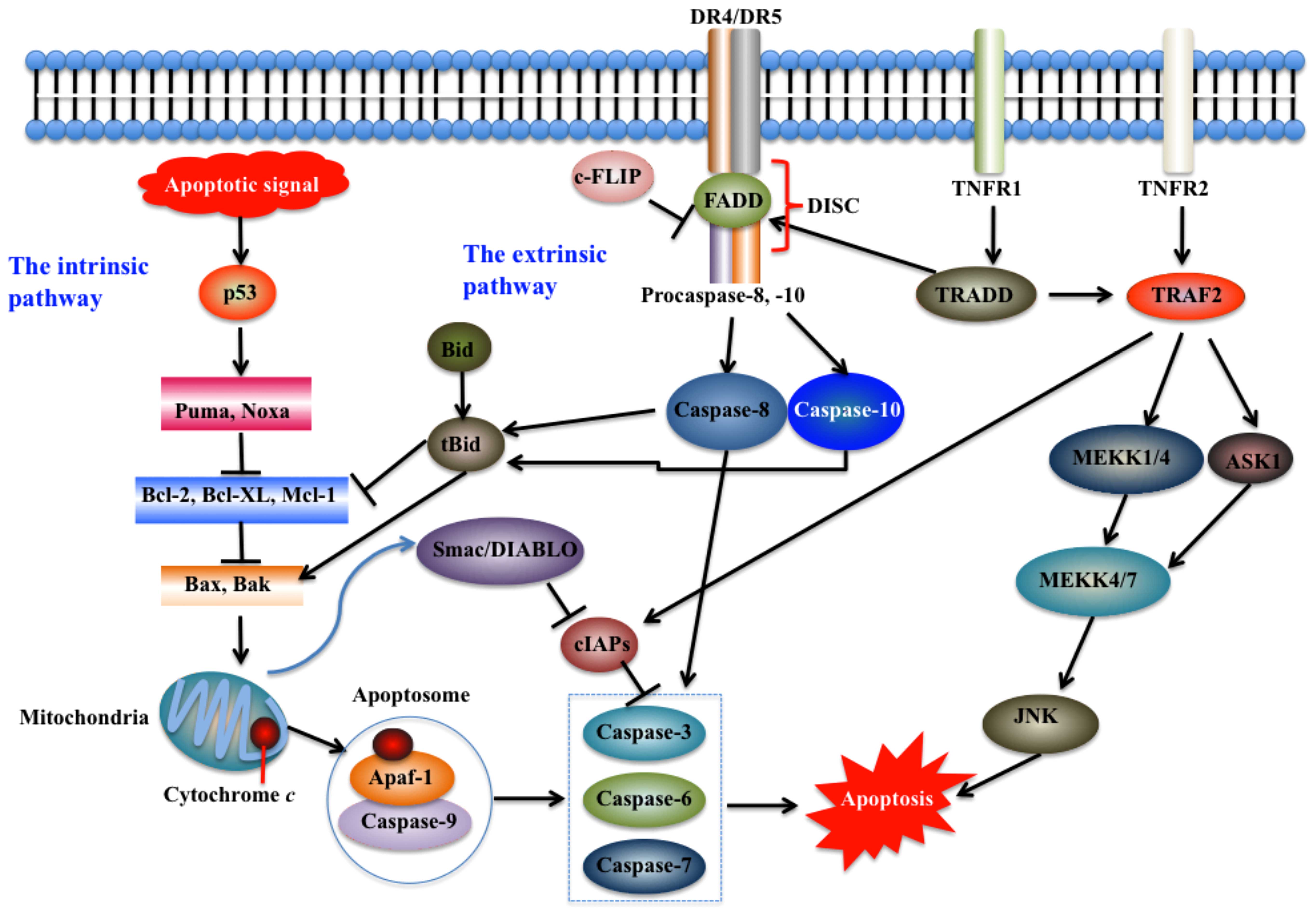 Although the extrinsic and intrinsic pathways may function separately, crosstalk between these two pathways has been extensively reported. For example, the activation of the extrinsic pathway promotes caspase-8-mediated processing of tBid, which subsequently stimulates Bax and Bak to engage the intrinsic pathway (Fig. 1) (12). Another well-studied crosstalk mechanism between these two pathways regards the stimulation of the intrinsic pathway by the tumor suppressor p53, which also upregulates some of the pro-apoptotic receptors such as DR5 and augments extrinsic signaling (12). In addition, a waxy lipid molecule known as ceramide may directly interfere with the mitochondrion and trigger the activation of the mitochondrial permeability transition (MPT) pore, which further leads to the permeabilization of the mitochondrial outer membrane, the release of mitochondrial intermembrane pro-apoptotic messengers and the induction of apoptotic cascades (22).