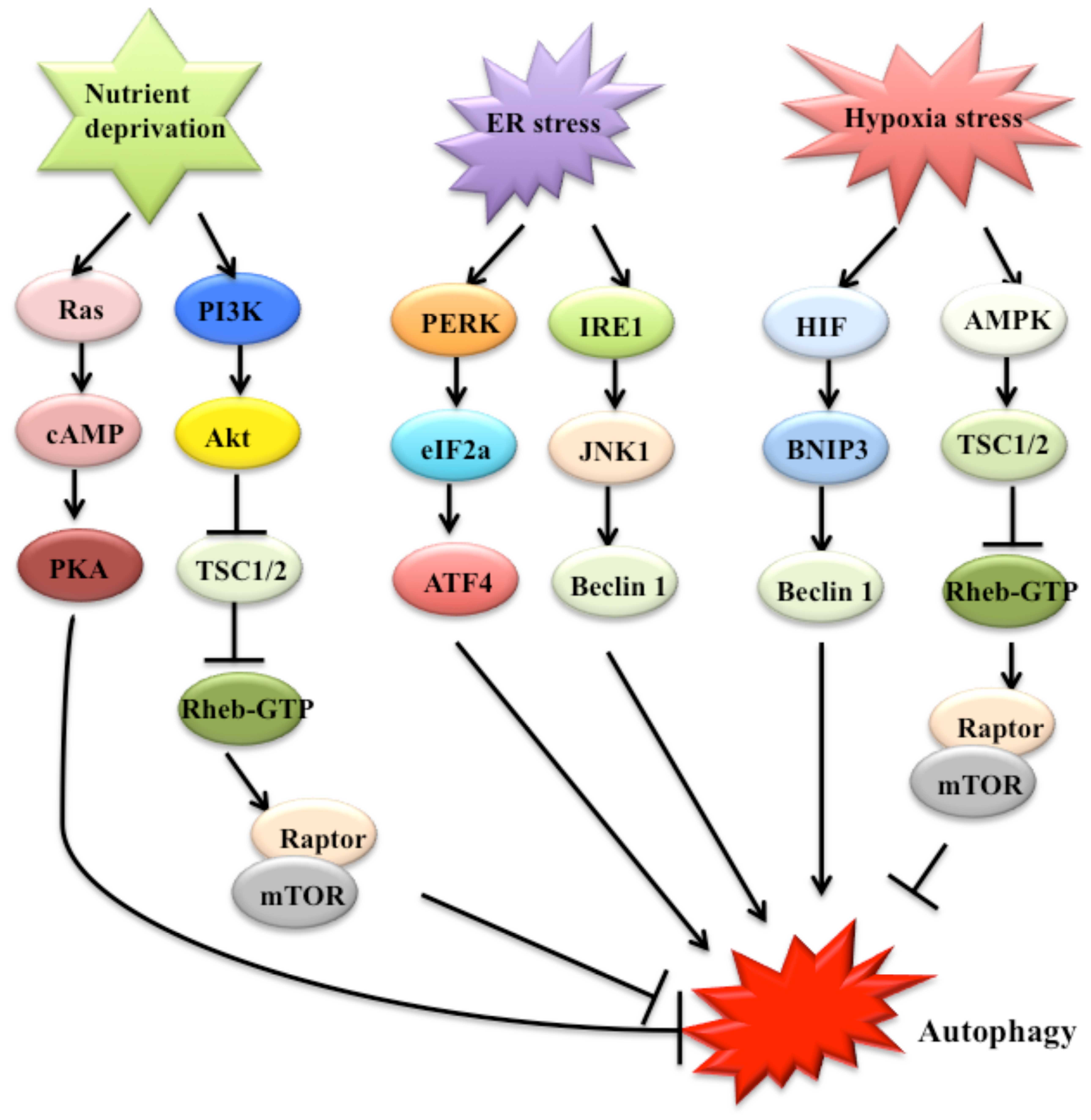 The regulation of autophagy is complicated and may involve multiple pathways, such as nutrient deprivation, and various stresses (23). Nutrient deprivation may significantly induce autophagosome formation (28). Two well-characterized signaling cascades, including the target of rapamycin (TOR) and Ras-cAMP-dependent protein kinase A (PKA) pathways, sense nutrient status (Fig. 2) (23). TOR regulates nutrient sensing, cell growth, and autophagy (24). TOR activates downstream proteins, including Akt kinase (also known as protein kinase B), phosphoinositide-3 kinase (PI3K) and growth factor receptor (29). Collectively, the Ras/cAMP-dependent PKA signaling pathway plays an important role in glucose sensing in yeast cells and mammals. Under nutrient-rich conditions, two Ras homologs, namely, Ras1 and Ras2, are active and enhance cAMP generation through adenylyl cyclase in yeast (30). Elevated cAMP binds to bypass of cyclic-AMP requirement 1 (Bcy1) and inhibits PKA (23). The constitutive activation of the Ras/PKA pathway may suppress autophagy that is induced by TOR inhibition (23). Various extra- and intracellular stresses, such as endoplasmic reticulum (ER) stress, hypoxia and oxidative stress, potentially induce autophagy (23). ER stress stimulates autophagy through the double stranded RNA-activated protein kinase-like ER kinase-eukaryotic initiation factor-2α (PERK-eIF2α) pathway, the inositol requiring enzyme 1 (IRE1)/c-Jun N-terminal protein kinase (JNK)1 pathway, and Ca2+ release (23,31) (Fig. 2). The activation of eIF2α by PERK may enhance the transcription of autophagic genes, such as ATG12 (32). Hypoxia activates autophagy through effects that are dependent on both target genes induced by hypoxia-inducible factor (HIF) and through HIF-independent effects that are mediated by downstream TOR inhibition of AMP-activated protein kinase (AMPK), regulated in development and DNA damage responses 1 (REDD1) and tuberous sclerosis proteins 1 and 2 (TSC1/TSC2) (Fig. 2) (24,28,33). Specific targets of HIF in autophagy include BCL2/adenovirus E1B 19 kDa protein-interacting protein 3 (BNIP3) and BNIP3-like protein (BNIP3L), which are noncanonical members of the Bcl-2 superfamily (Fig. 2) (25,28).