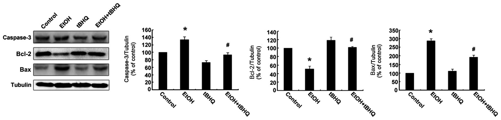 We performed a flow cytometric analysis and found that ethanol caused a substantial increase in the number of apoptotic cells, whereas pre-treatment with tBHQ significantly lowered the amount of apoptotic cells compared with the cells exposed to ethanol alone (Fig. 2). In addition, the results of western blot analysis revealed that the H9c2 cells exposed to ethanol manifested a marked increase in the expression of the apoptotic protein, caspase-3, and the pro-apoptotic protein, Bax, while a significant decrease in the expression of the anti-apoptotic protein, Bcl-2, was observed. However, the pre-treatment with tBHQ markedly inhibited the ethanol-induced increase in caspase-3 and Bax expression, and enhanced Bcl-2 expression (Fig. 3).