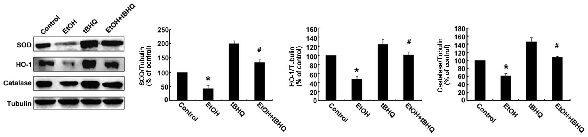 Western blot analysis was performed to determine whether tBHQ affects the expression of Nrf2 downstream antioxidant proteins (SOD, HO-1, and CAT) in H9c2 cells exposed to ethanol. As illustrated in Fig. 5, the protein expression of SOD, HO-1 and CAT was decreased in the ethanol-exposed cells compared with that in the ethanol-untreated cells, whereas it was restored by tBHQ in the ethanol-exposed H9c2 cells.