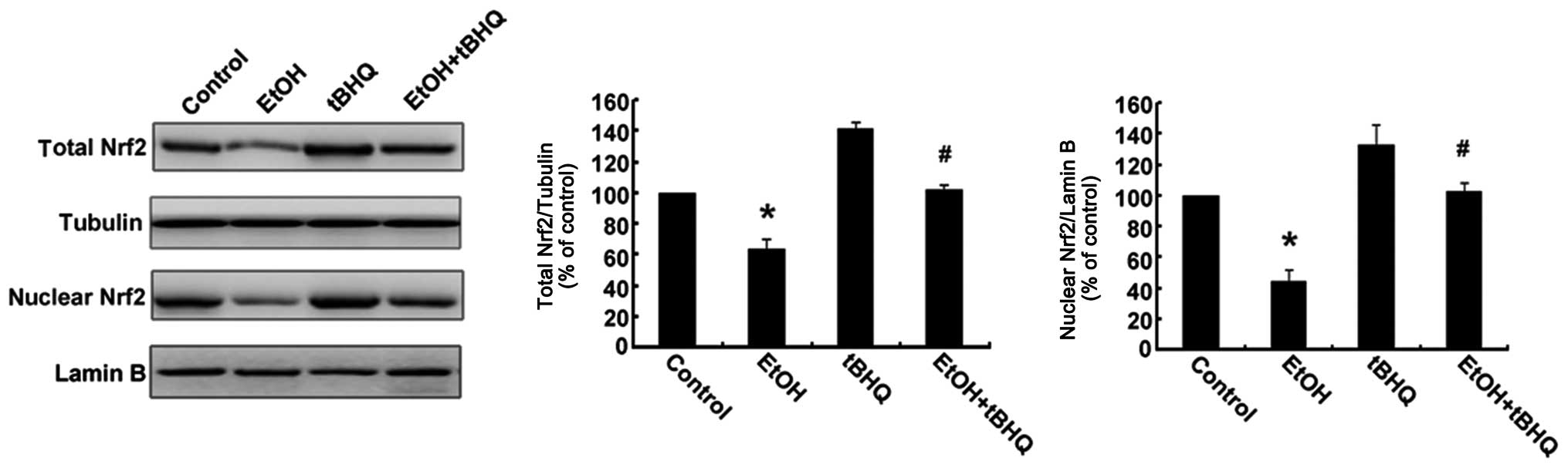 As depicted in Figs. 6 and 7, ethanol inhibited not only Nrf2 protein expression, but also Nrf2 nuclear translocation, which may have made the cells more sensitive to ethanol-induced toxicity. tBHQ alone partially, but significantly increased the Nrf2 protein level in the H9c2 cells. Pre-treatment wit htBHQ restored the level of Nrf2 protein and promoted its nuclear accumulation in the H9c2 cells, which were inhibited by exposure to ethanol, which may have elicited the cytoprotective response, resulting in the increased resistance of the cells to the ethanol challenge. The above-mentioned results were confirmed by western blot analysis and immunofluorescence staining.