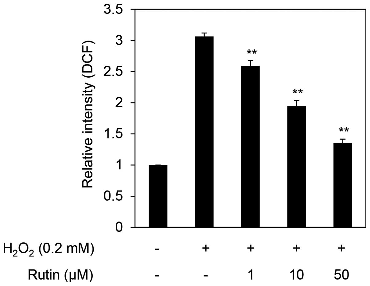 Figure 3Reactive oxygen species (ROS) scavenging effects of rutin on H2O2-treated human dermal fibroblasts (HDFs). **P<0.01 as determined by the Student's t-test. |