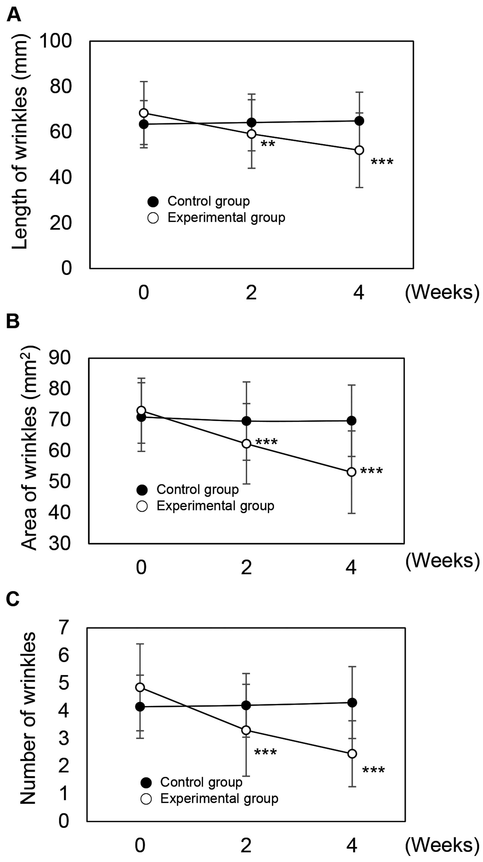 To evaluate the extent of improvement in wrinkles, particularly at the eye rim, a Robo skin analyzer CS50 (Inforward Inc., Tokyo, Japan) was used. The facial images were captured from each subject placed in identical positions with equal lighting: on the front, left and right sides of the face. To evaluate improvement, measurements were taken three times: prior to application, and 2 and 4 weeks after application. We analyzed the captured images, matching the facial feature points accurately. The measurement unit of crow's feet length is mm and area is mm2.