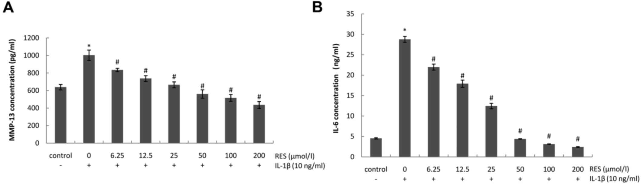 To determine whether resveratrol exerts anti-catabolic and anti-inflammatory effects on IL-1β-stimulated chondrocytes, the expression levels of MMP-13 and IL-6 were detected in chondrocyte culture supernatants. As shown in Fig. 3, the levels of MMP-13 and IL-6 were significantly upregulated in the presence of IL-1β (10 ng/ml). By contrast, treatment with resveratrol (6.25–200 µM) effectively antagonized these catabolic and inflammatory effects in a dose-dependent manner.