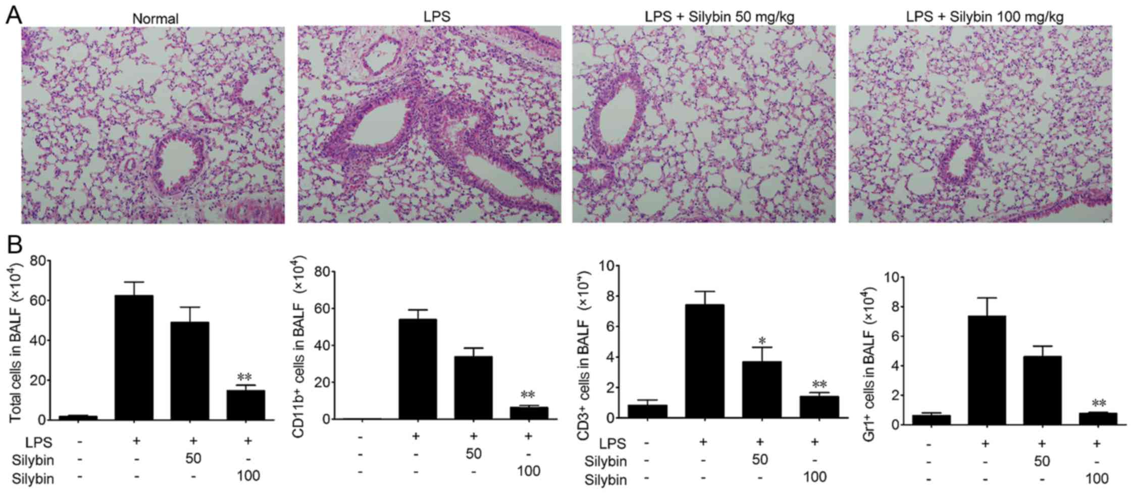 In the present study, we used a mouse model of LPS-induced ALI to evaluate the therapeutic effects of silybin. Mice were challenged with LPS and lung tissue samples were collected, and the sections stained with H&E as shown in Fig. 1A. The lung tissues from the LPS group exhibited significant pathological alterations, including notable inflammatory cell infiltration, interstitial and intra-alveolar edema, and patchy hemorrhage, inter-alveolar septal thickening, hyaline membrane formation and some collapsed alveoli. By contrast, a marked attenuation of these responses was observed in the lungs of mice treated with either 50 or 100 mg/kg silybin (Fig. 1A). Next, the infiltration of inflammatory cells in BALF was examined. As shown in Fig. 1B, the number of total cells, macrophages (CD11b+), T cells (CD3+) and neutrophils (Gr1+) in BALF was significantly increased following LPS stimulation, while treatment with silybin dose-dependently reduced the infiltration of inflammatory cells.