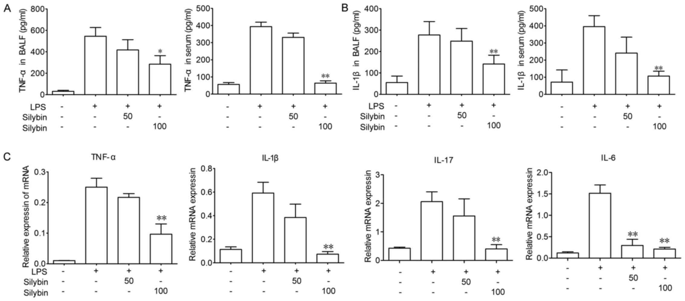 Next, the anti-inflammatory properties of silybin were evaluated by determining the mRNA and protein levels of inflammatory cytokines, including TNF-α and IL-1β. LPS stimulation significantly increased the levels of TNF-α and IL-1β in BALF, as well as the serum levels, whereas treatment with silybin significantly decreased these cytokine levels (Fig. 2A and B). In addition, LPS stimulation significantly elevated the mRNA levels of TNF-α IL-1β, IL-17 and IL-6 in lung tissue, whereas treatment with silybin dose-dependently decreased the mRNA levels of these cytokines (Fig. 2C).