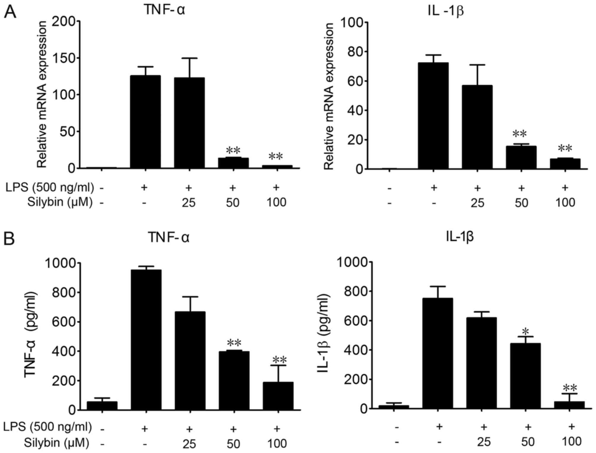 To further investigate the protective effects of silybin against LPS-induced lung injury and the underlying mechanisms, we used RAW264.7 cells. LPS stimulation significantly elevated the mRNA and protein levels of TNF-α and IL-1β in the RAW264.7 cells (Fig. 4). Co-incubation with silybin and LPS dose-dependently decreased the mRNA expression levels of TNF-α and IL-1β (Fig. 4A), as well as the protein levels in the cell culture medium (Fig. 4B).