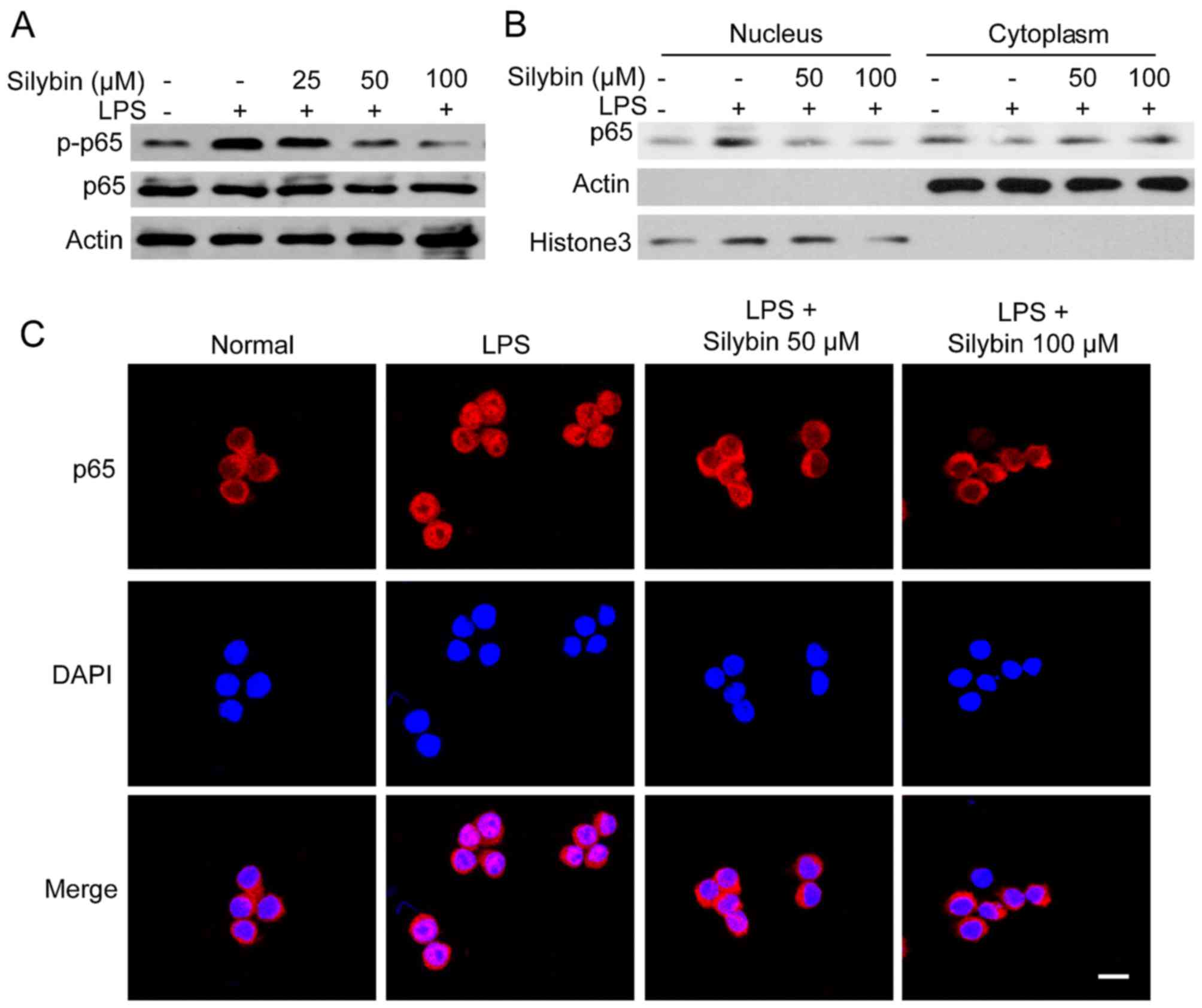 As observed in our mouse model, treatment with silybin inhibited the phosphorylation of NF-κB. Thus, we wished to determine whether it can also inhibit NF-κB signaling in vitro. Upon exposure to LPS, the levels of phosphorylated NF-κB (p65) were significantly increased. However, pre-treatment with silybin for 3 h dose-dependently suppressed the phosphorylation of NF-κB (Fig. 5A). Moreover, silybin decreased the nuclear trans-location of NF-κB (p65) (Fig. 5B). The results of western blot analysis of the cytoplasmic and nuclear content revealed that the level of NF-κB (p65) in the nucleus was reduced by silybin treatment (Fig. 5B). Using immunofluorescence staining, strong NF-κB (p65) staining in the nucleus was observed following stimulation with LPS, whereas in the silybin-treated cells, NF-κB (p65) was mainly located in the cytosol (Fig. 5C). These results suggest that the anti-inflammatory effects of silybin may result from the inhibition of NF-κB.