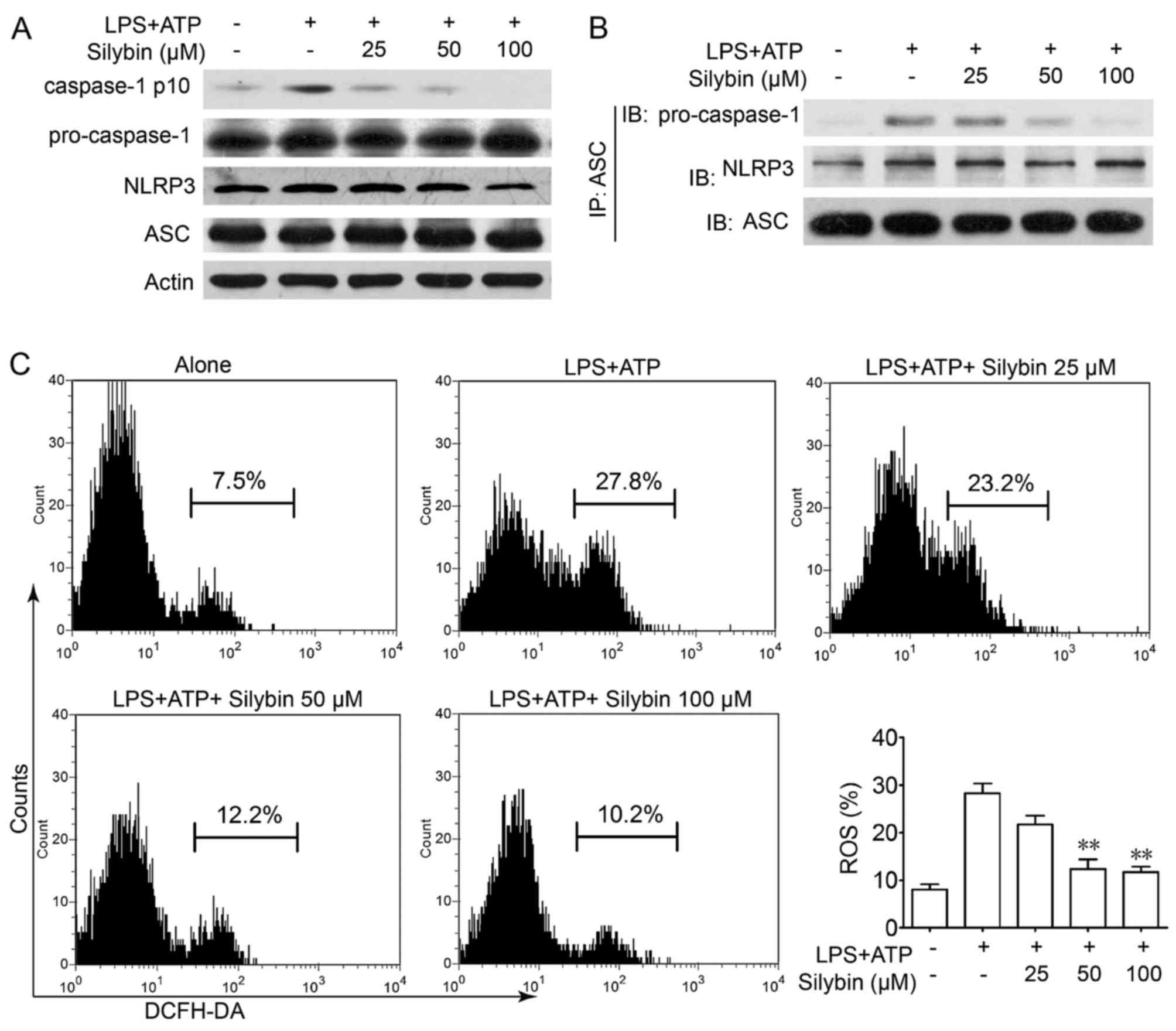It is worth noting that there is evidence to indicate that IL-1β is processed as an inactive cytoplasmic precursor (pro-IL-1β and pro-IL-18) that requires cleavage by caspase-1 to produce the mature active forms (25,26). As caspase-1 needs to be activated by the NLRP3 inflammasome, we then evaluated the effects of silybin on caspase-1 activation in THP-1 cells. Treatment with silybin inhibited caspase-1 activation in a concentration-dependent manner (Fig. 6A). Furthermore, immunoprecipitation analysis revealed that the process of NLRP3 inflammasome formation was also interrupted by silybin (Fig. 6B). It has been reported that in the presence of signal I (NF-κB signaling), the NLRP3 inflammasome is activated by ROS signaling which leads to the production of caspase-1 (27). Treatment with LPS and ATP led to ROS generation, whereas treatment with silybin significantly scavenged ROS (Fig. 6C). These results indicate that silybin may reduce ROS generation and interrupt the activation of the inflammasome in macrophages, thereby inhibiting the cleavage of caspase-1 and the production of cytokines.
