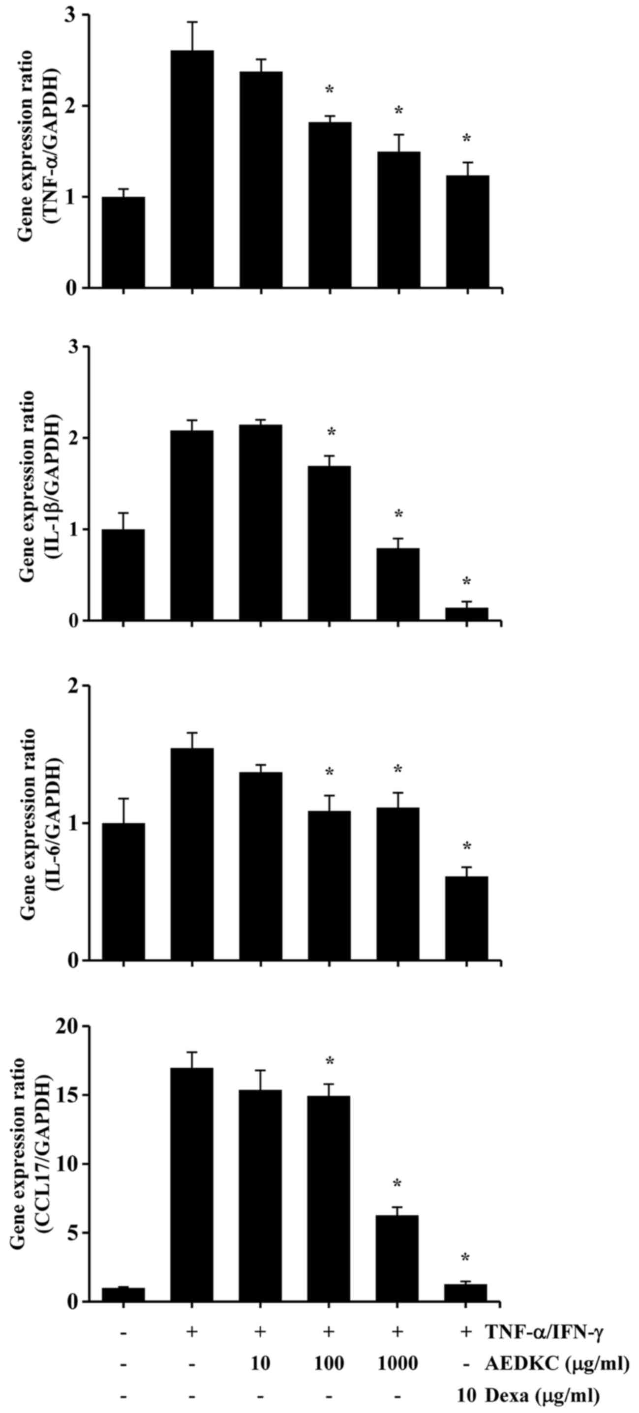 In AD condition, keratinocytes release a characteristic form of cytokines/chemokines after pro-inflammatory cytokine exposure (36). TNF-α and IFN-γ can synergistically induce important cytokines for AD symptoms in keratinocytes, and this experimental model has been widely used to mimic the AD environment in vitro (4,27). Several studies have reported that CCL17 is overexpressed in the serum of AD patients, and that the severity of AD is strongly correlated with the chemokine levels (37,38). Dexamethasone is an effective immunosuppressive medication widely used in the treatment of AD (39). Thus, it was used as a positive control. The present results indicated that AEDKC treatment suppressed TNF-α/IFN-γ-induced TNF-α, IL-1β, IL-6 and CCL17. Compared to the effects of dexamethasone, AEDKC at a high dose showed a similar immune suppressive effect in keratinocytes.