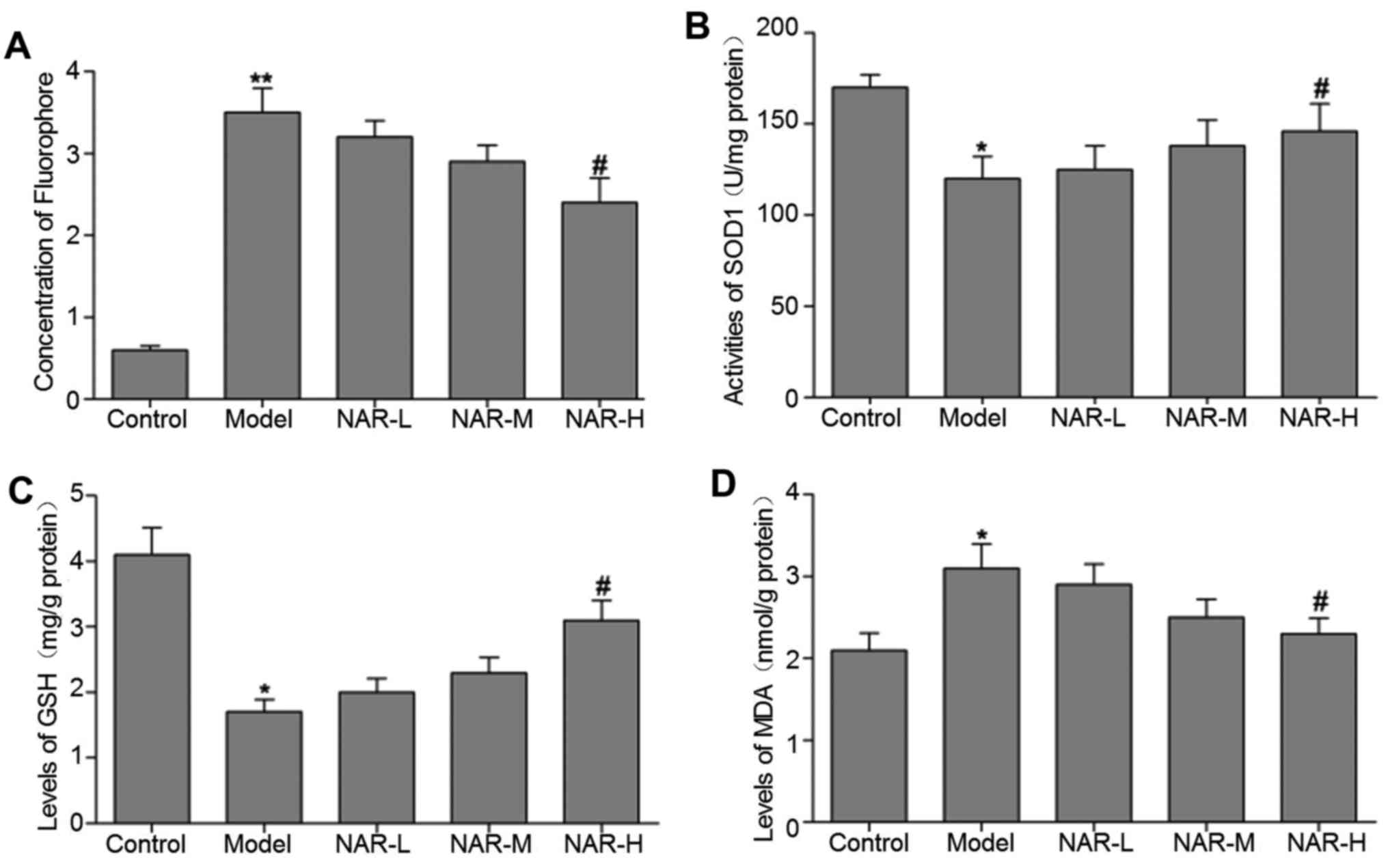 The generation of ROS was measured by chloromethyl-2′,7′dichlorodihydro fluorescein diacetate (CM-H2DCFDA) staining. For CM-H2DCFDA staining, cells were washed with ice cold PBS and treated with 10 μM CM-H2DCFDA (Invitrogen, Thermo Fisher Scientific) in DMEM for 45 min. Cells were then trypsinized and suspended in phosphate-buffered saline (PBS) and fluorescence was measured at 538 nm. Furthermore, the activities of superoxide dismutase 1 (SOD1) and glutathione (GSH), and the content of malondialdehyde (MDA), in the different groups were determined to assess the anti-oxidative effects of NAR using commercial kits (Nanjing KeyGen Biotech Co., Ltd., Nanjing, China).