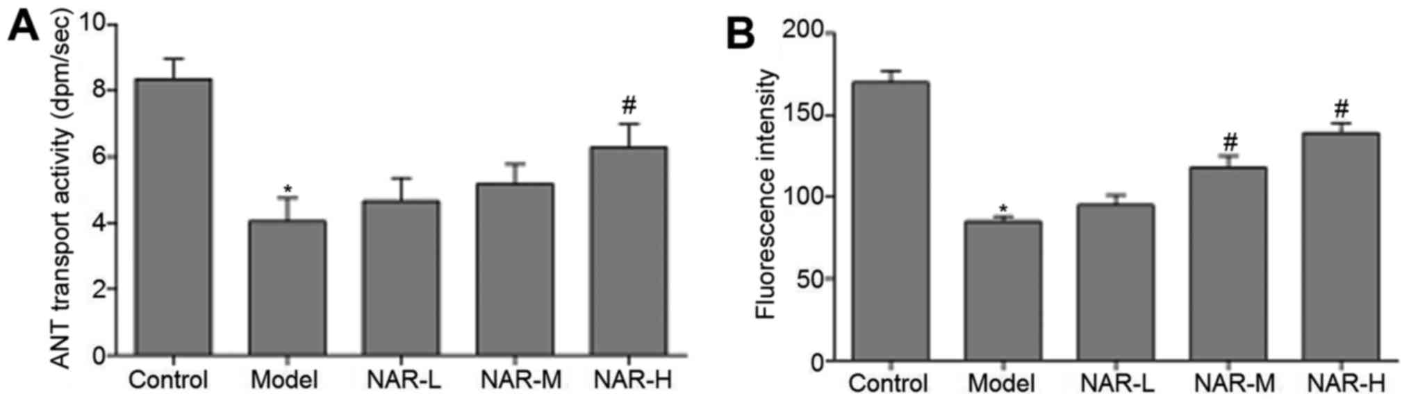 The authors further explored the effect of NAR on mitochondrial dysfunction. First, the levels of intracellular adenylate in each group were determined. The data indicated that ATP, ADP and AMP were significantly decreased in the model group, whereas adenylate levels in the NAR-H group were notably improved. In addition, ANT transport activity and Δψm were analyzed. The results indicated that ANT transport activity and Δψm were significantly reduced in the model group, but were markedly increased in the NAR-H group. These observations revealed that NAR could attenuate mitochondrial dysfunction by enhancing ANT transport activity and Δψm and restoring energy production.