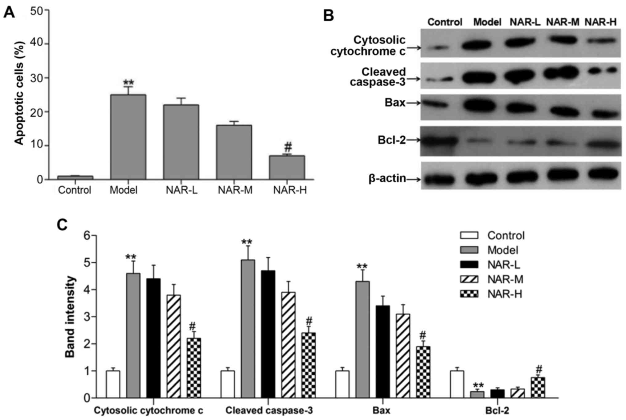 It is well established that intracellular oxidative stress and mitochondrial dysfunction cause cell injury and neurotoxicity (25). Therefore, flow cytometry was performed to assess cell apoptosis in the different groups. As shown in Fig. 3A, the number of apoptotic cells was significantly increased in the model group when compared with the control group (P<0.01), while the number of apoptotic cells was significantly decreased in the NAR-H group when compared with the model group (P<0.05). To verify results of the apoptosis assay, western blot analysis was performed to detect markers of apoptosis, namely B-cell lymphoma 2 (Bcl-2), Bcl-2-associated X protein (Bax), cytosolic cytochrome c and cleaved caspase-3 (Fig. 3B and C). A strong increase was observed in the expression of Bax and reduced expression of Bcl-2 in the model group (P<0.01). Furthermore, the expression levels of cytosolic cytochrome c and cleaved caspase-3 were markedly increased in the model group (P<0.01). However, high-dose NAR could reverse these expression changes (P<0.05). An MTT method was subsequently used to measure cell viability in the different groups. The data indicated that the viability of cells was significantly decreased in the model group and increased in the NAR-H group (P<0.05; Fig. 4A). However, neuronal viability, along with the rate and markers of apoptosis, did not differ significantly in the NAR-L and NAR-M groups (P>0.05).