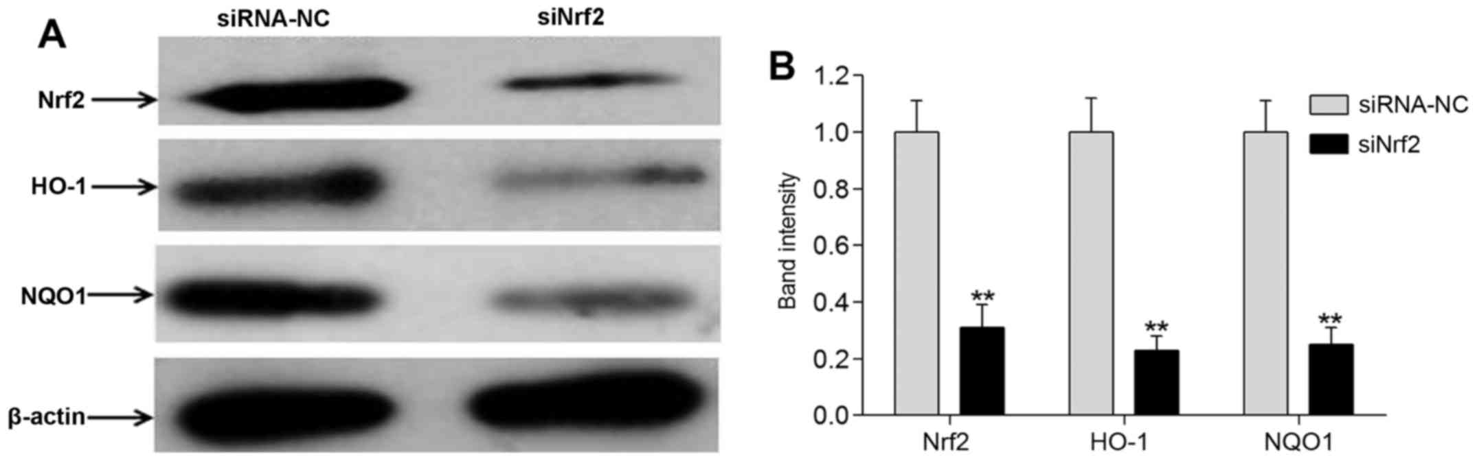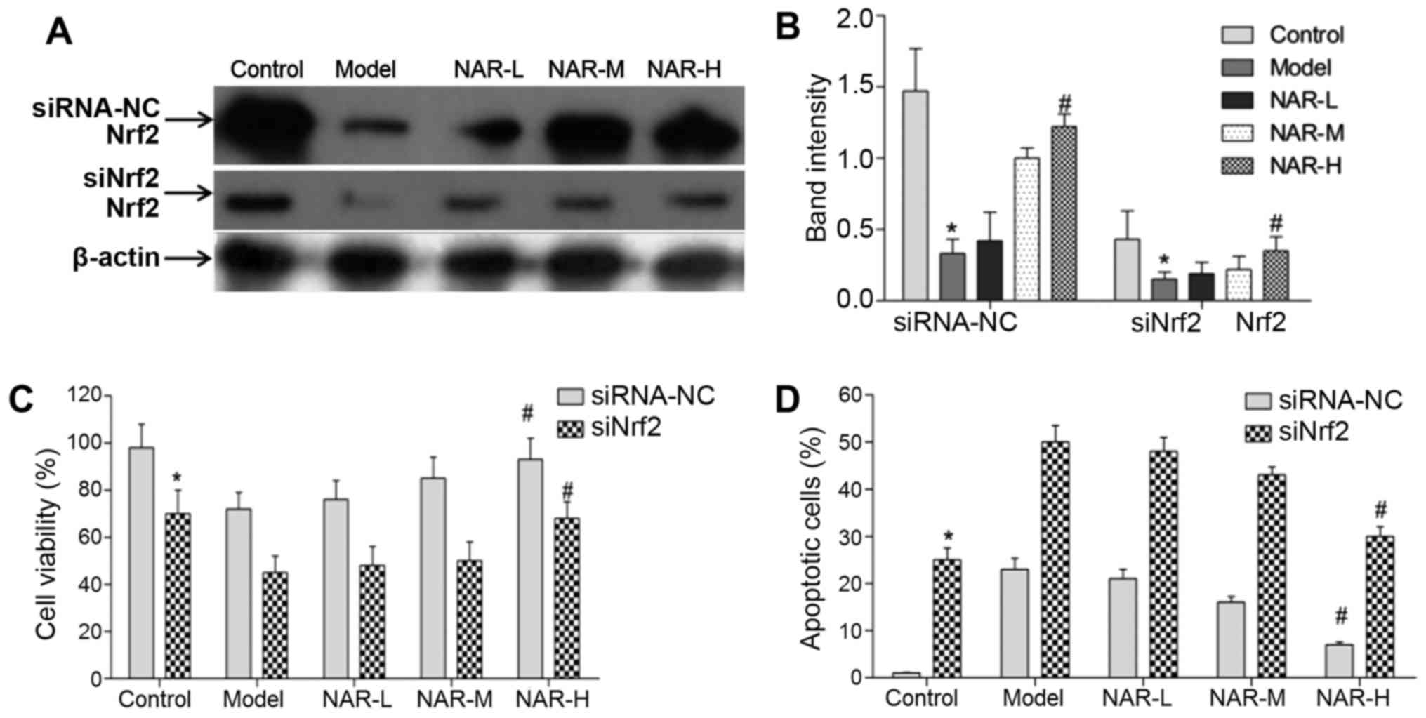Cells were harvested during the logarithmic growth phase. Small interfering RNAs (siRNAs) against Nrf2 (siNfr2) and negative control siRNAs (siRNA-NC) were purchased from Shanghai GenePharma Co., Ltd. (Shanghai, China) and transfected into cells using Lipofectamine 2000 (Invitrogen, Thermo Fisher Scientific), according to the manufacturer's protocol. The sequences of siNrf2 and siRNA-NC are presented in Table I. Following transfection, western blotting was used to assess the transfection efficiency, and model and NAR treatment groups were established prior to further experiments.