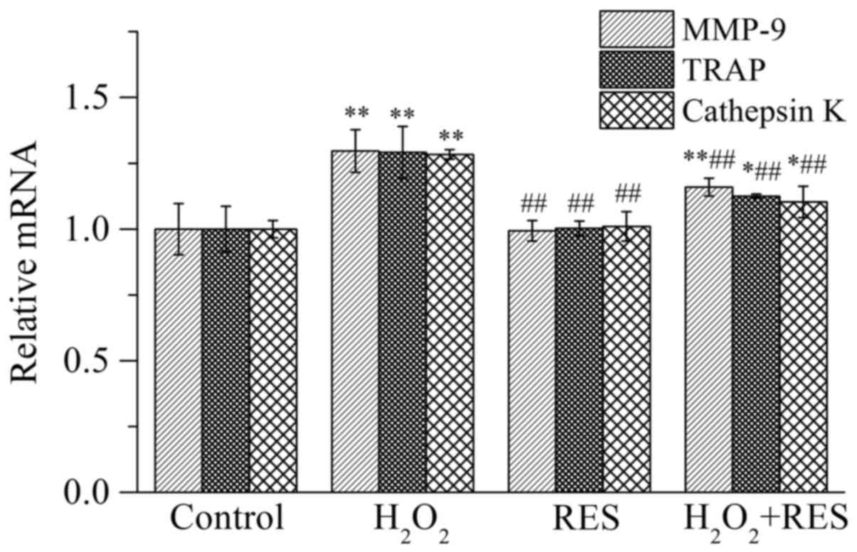 In order to evaluate the osteoclast activity in vitro, the expression of osteoclast marker enzymes was assessed by employing RT-PCR, including matrix metalloproteinase-9 (MMP-9), TRAP, and cathepsin K. Expressed specifically by osteoclasts, these three enzymes are important indices which reflect osteoclast activity as well as bone resorption function. As shown in Fig. 5, compared with the control group, the mRNA expression levels of MMP-9, TRAP and cathepsin K were increased (P<0.01) in the presence of 10−4 M H2O2, indicating that osteoclast activity along with bone resorption function was facilitated by H2O2. In contrast, following treatment of the cells with RES at 10−5 M, the expression levels of the osteoclast marker enzymes were reduced compared with the H2O2 group (P<0.01), indicating that RES inhibited osteoclast activity and bone resorption capacity.